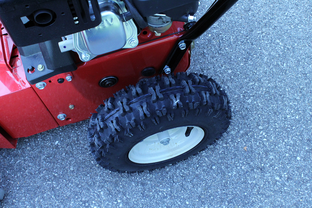 Die MTD Optima PS 700 kommt fast vollständig zusammengebaut. Daher bereitet die Montage keinerlei Probleme. Nur die Schwenkstange zum Verstellen der Kehrwalzen muss noch angebracht werden. Das ist mit wenigen Handgriffen erledigt und schon ist die Maschine einsatzbereit. Verarbeitungstechnisch lässt sich die PS 700 ebenfalls nichts zu Schulden kommen. Der Prallschutz oberhalb der beiden Kehrbüsten wurde aus robustem Metall gefertigt. Das Gleiche gilt für die Schwenkstange und den Griffholm. Die beiden Griffe sind mit einer Gummipolsterung für einen angenehmen Halt überzogen. Die beiden Antriebsräder wurden aus extrem robustem Gummi gefertigt und punkten durch ein tiefes High-Grip-Profil. Damit lässt sich die Kehrmaschine sogar im Schnee verwenden. Eine Verletzungsgefahr durch scharfe Kanten oder spitz herausstehende Teile ist nicht gegeben. Auch an der Verarbeitungsqualität des Motors haben wir nichts auszusetzen. Selbst bei starken Erschütterungen läuft kein Benzin oder Öl aus.