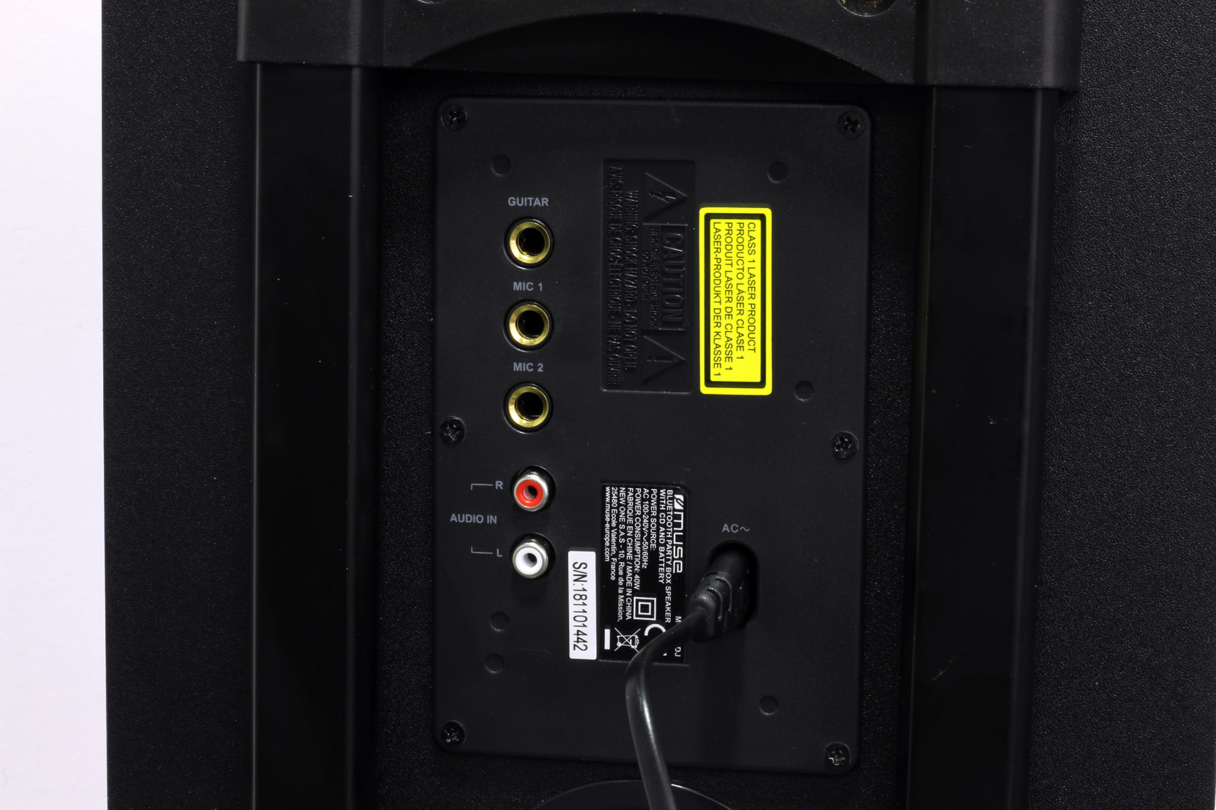 Alle weiteren Schnittstellen wie zwei weitere AUX-Eingänge in RCA-Ausführung befinden sich an der Hinterseite. Der Nutzer kann den Muse auch als Gitarrenverstärker über den entsprechenden Anschluss verwenden. Außerdem wartet die Rückseite mit zwei Mikrofoneingängen auf. Praktischerweise befindet sich ein kabelgebundenes Mikrofon bereits im Lieferumfang. Über einen stufenlosen Drehschalter lässt sich die Stimme noch mit einem Echo-Effekt unterlegen. Wer direkt zu seinen Lieblingssongs singen möchte, ist hier definitiv an der richtigen Adresse. Die Mikrofonqualität hat uns insgesamt gut gefallen.