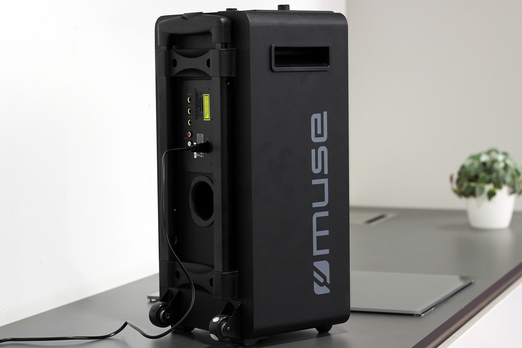 Mit Abmessungen von knapp 53 Zentimetern in der Höhe, 26 Zentimetern in der Tiefe und 25,5 Zentimetern in der Breite ist der Muse M-1920 DJ sicherlich nicht gerade zurückhaltend. Für einen PA-Lautsprecher sind die Dimensionen jedoch völlig normal. Das Gewicht ist mit knapp neun Kilogramm ebenfalls moderat ausgefallen. Der Nutzer kann die Box über die beiden Haltegriffe an den Seiten auch gut tragen. Wer das nicht möchte, kann den DJ auch mithilfe der Rollen und des Teleskopgriffs schieben oder ziehen. Die Rollen sind schön leichtgängig, der Griff wie oben erwähnt allerdings recht klapprig.