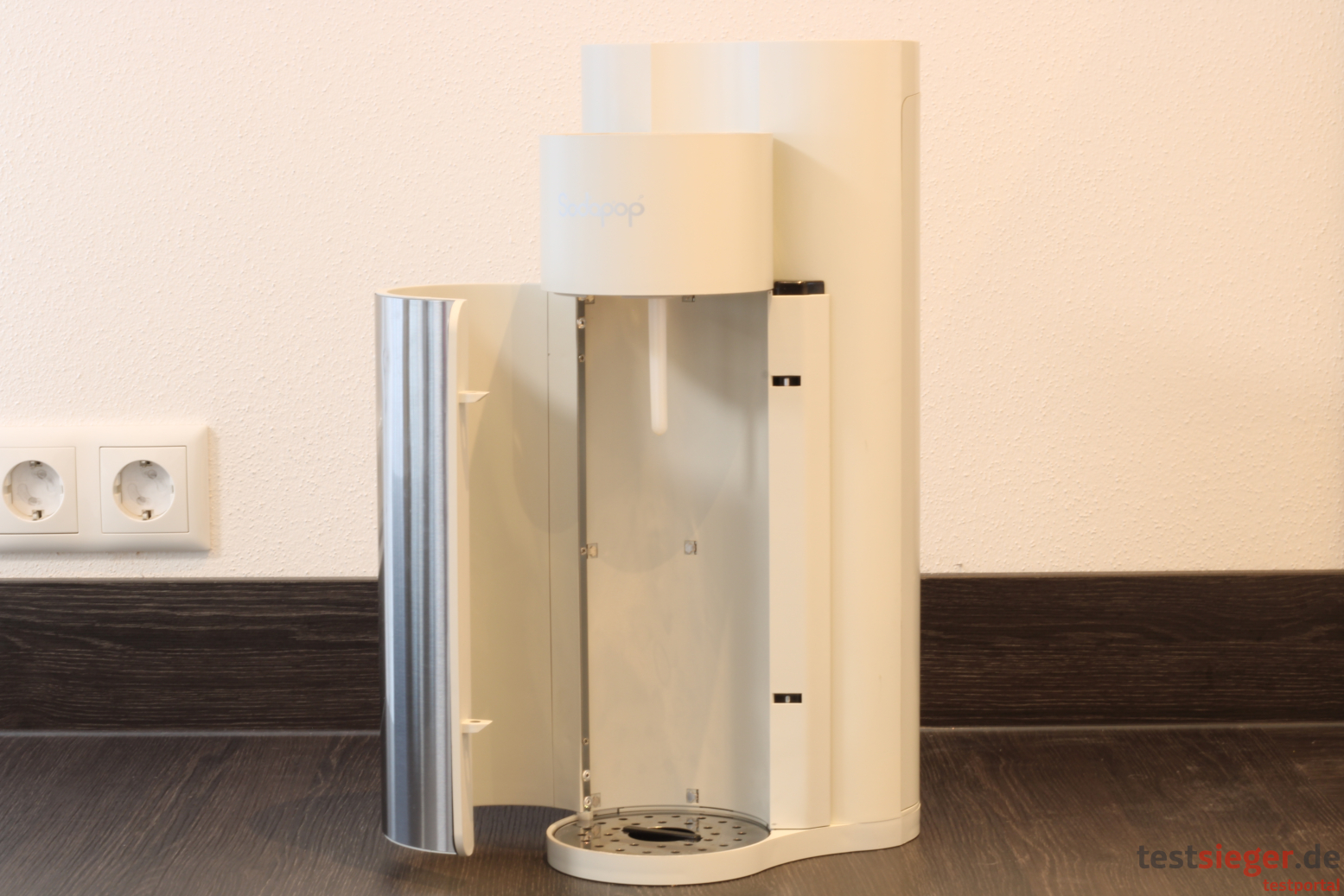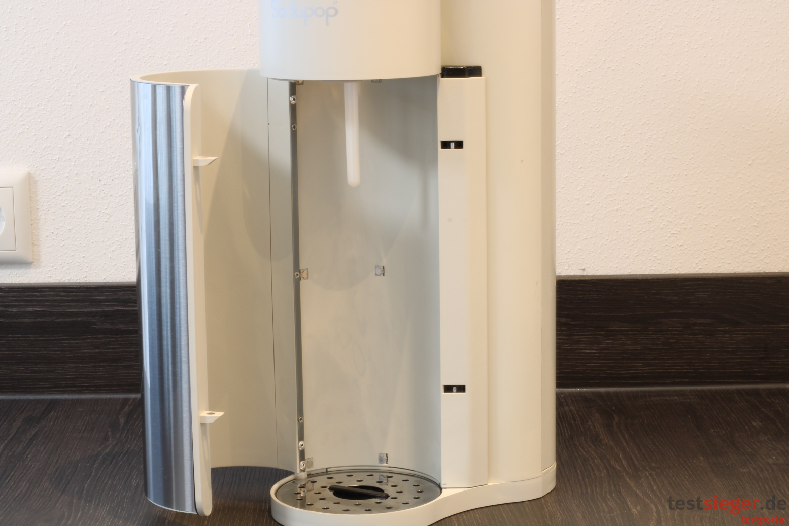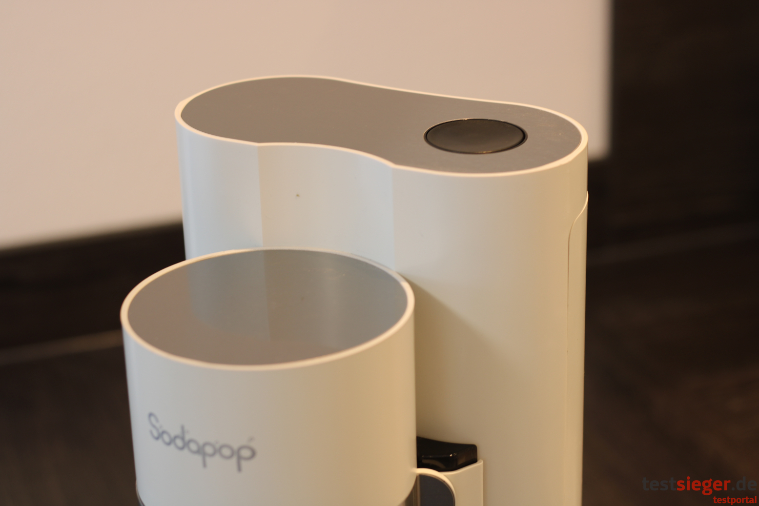 Um bei der Verwendung der Glasfalsche die größtmögliche Sicherheit zu bieten, verfügt der Harold über ein geschlossenes Sprudelsystem. Zum Öffnen der zylinderförmigen Klappe einfach den entsprechenden Knopf nach unten drücken, dann lässt sich die Abdeckung ohne Kraftaufwand zur Seite klappen. Das Eindrehen der Flaschen funktioniert insgesamt recht gut, allerdings muss der Nutzer die Karaffen beim Einsetzen sehr schräg halten. Das bereitet in der Praxis zwar keine großen Probleme, eine etwas höher gelegene Sprudeldüse hätte die Sache jedoch noch etwas komfortabler gemacht. Beide Flaschen lassen sich auch mit nur einer Hand eindrehen, aufgrund des niedrigeren Gewicht klappt es jedoch bei der Kunststoffvariante etwas einfacher. Danach hängen sie fest im Gewinde und nach dem Schließen der Klappe kann das Sprudeln auch schon beginnen. Zum Aufsprudeln verfügt der MySodapop Harold über einen großen Knopf an der Oberseite. Dieser hat einen angenehmen Druckpunkt und lässt sich problemlos betätigen.