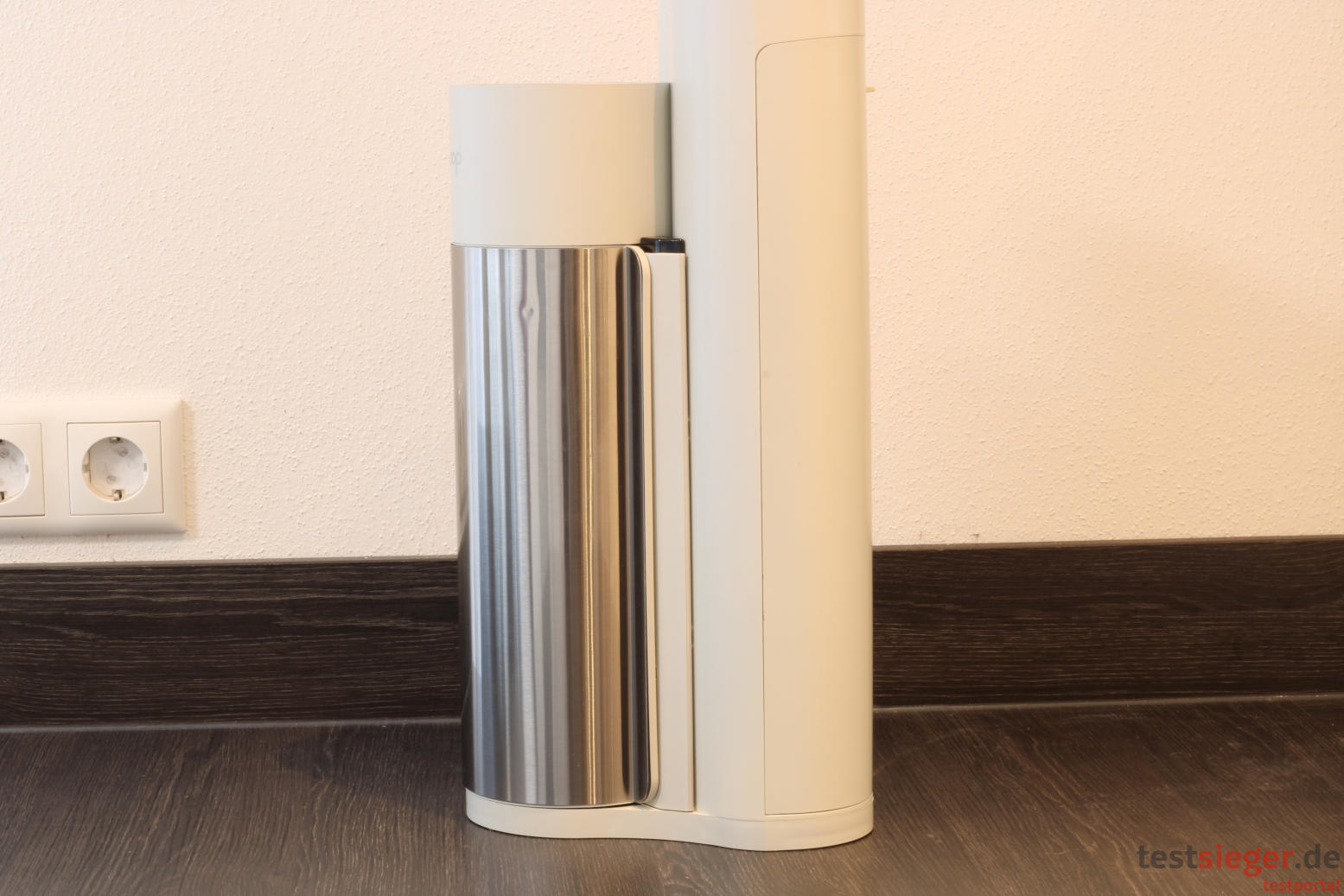 Die ausführliche Anleitung gibt dem Nutzer den Tipp an die Hand, die Taste beim Aufsprudeln mehrmals kurz zu drücken, anstatt sie länger zu halten. Dementsprechend halten wir uns im Test auch zunächst an den Hinweis. Die Zubereitung funktioniert tadellos. Nach dreimaligem Drücken weist das Wasser einen leichten bis mittleren Kohlensäuregehalt auf, nach 6 kurzen Stößen ist die Flüssigkeit mittel bis stark aufgesprudelt. Wer die Taste trotzdem lieber am Stück betätigen möchte, muss keine Bedenken haben. Nach knapp 7 Sekunden erzielt der Nutzer einen hohen CO2-Gehalt. Wir drücken die Taste im Test bis zu 10 Sekunden lang und stellen keine Auffälligkeiten fest. Da die Flaschen nicht bis zum Rand gefüllt sind und der Verschluss durch einen guten Druckausgleich punktet, müssen Nutzer keine Angst haben, dass selbst stark geschütteltes Wasser beim Öffnen überläuft. Wir messen während des Betriebs eine Lautstärke bis zu 75 Dezibel (dBa). Das ist zwar sicherlich nicht leise, da die Lärmbelästigung jedoch nur wenige Sekunden anhält, ist sie gut erträglich.