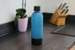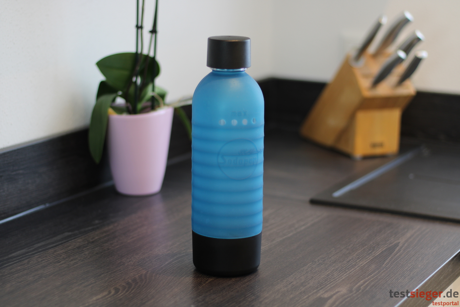 Die Flasche besteht zwar ebenfalls komplett aus Kunststoff, um die Gesamtoptik jedoch etwas aufzuwerten, hat sich mySodapop einen Kniff überlegt. Nahezu die komplette Flasche ist von einer leicht durchsichtigen Gummiummantelung überzogen. Diese sieht nicht nur schick aus, sondern verleiht der Flasche auch einen guten Halt in der Hand. Ein weiterer Vorteil: Die aufgedruckten Sicherheitshinweise sind so etwas abgedämpft und mindern die Gesamtoptik nicht so sehr. Wer möchte, kann den Überzug aber auch einfach abstreifen.