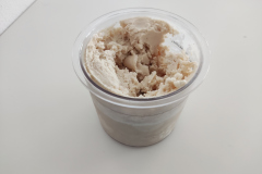 Nach der Zubereitung können wir Extras in die Masse geben. Dazu einen circa 4 Zentimeter breiten Tunnel in das Eis bohren und die Speisen hineingeben. Der Kreativität sind hier keine Grenzen gesetzt, von Weingummi, über Schokolade und Keks, bis hin zu Gewürzen oder Salzstangen ist alles möglich. Harte Extras vermengt die Maschine dabei nur, weiche verarbeitet sie. Wer keine Extras wünscht, aber trotzdem noch nicht mit dem Ergebnis zufrieden ist, kann die Re-Spin-Funktion wählen. Hier arbeitet die Creami das Eis in einem zweiten Durchlauf noch einmal durch.