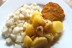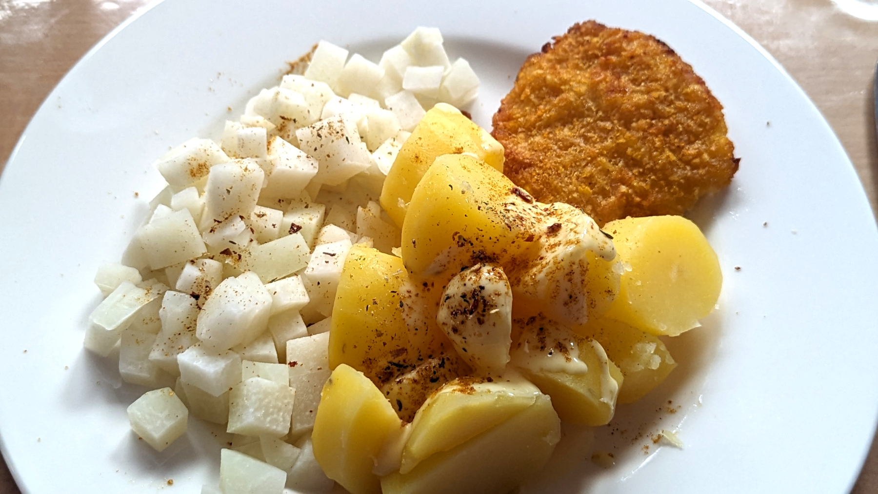 Für den Combi-Steam-Modus bereiten wir ein komplettes Gericht zu. Hier benötigen Nutzerinnen und Nutzer mindestens die zwei mitgelieferten Wenderöste. Auf dem Boden des Kochtopfes kommen geschnittene Kartoffeln und 400 Milliliter Wasser. Auf die mittlere Ebene geben wir 400 Gramm Kohlrabi in 2 Zentimeter großen Würfeln. Die obere Etage belegen wir mit 400 Gramm panierten Mini-Schnitzel. Der Garvorgang dauert inklusive Vorheizen etwa 15 Minuten (9 Minuten Garung / 6 Minuten Vorheizen). Die Ergebnisse hinterlassen einen gemischten Eindruck. Während die Kohlrabi-Würfel sowie die Kartoffelstücke und das Schnitzel einen sehr guten Garpunkt haben, bleibt ein Teil der Panade der Schnitzel am Wenderost hängen. Paniertes Fleisch sollte man daher aus unserer Sicht eher im Air-Fry-Programm nutzen.