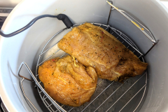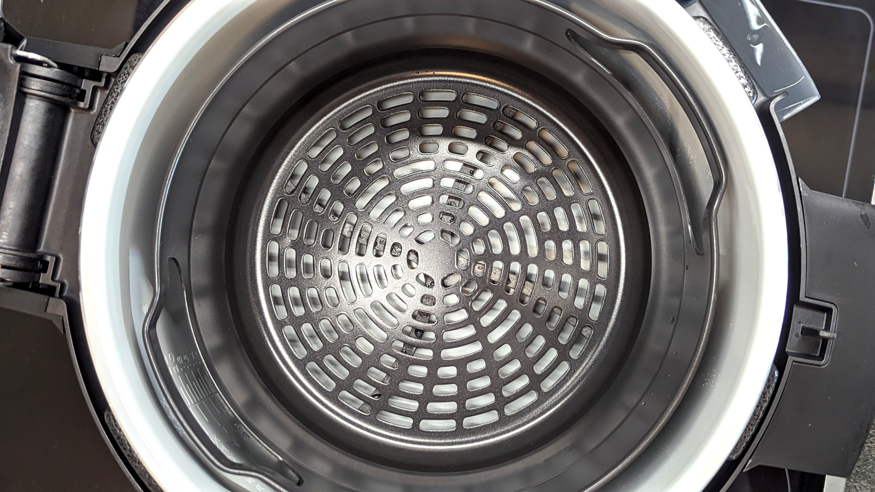 Für das Heißluft-Frittieren setzen wir den Gar- beziehungsweise Frittierkorb in den Kochtopf ein. Im Schnellkochtopf-Modus benötigen wir meist nur den unteren Wenderost, der das zu kochende Wasser von den Lebensmitteln trennt.