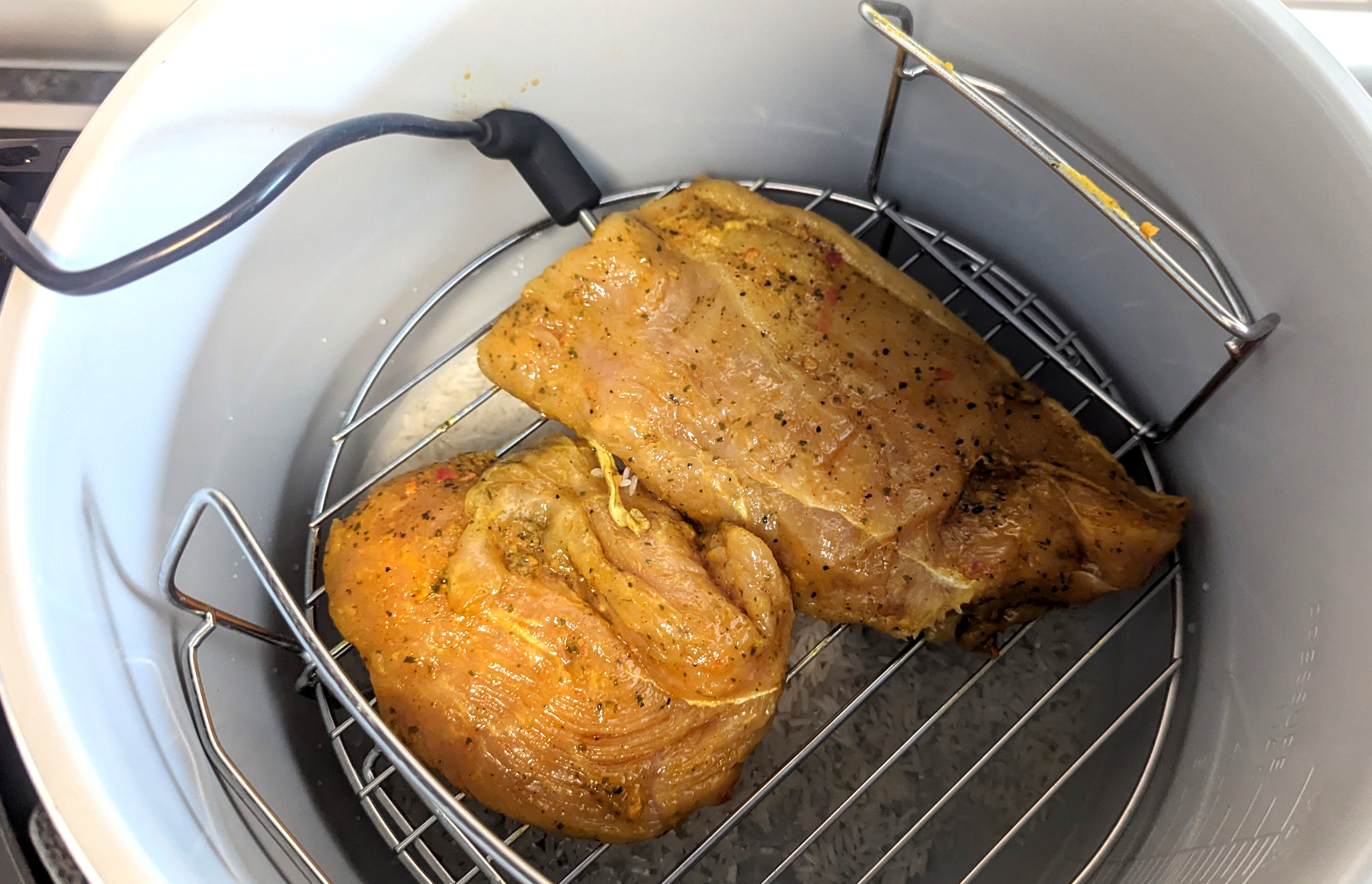 Die Zubereitung läuft je nach Modus und Zubehör ähnlich ab. Bei kompletten Mahlzeiten kommen Nudeln, Reis oder Kartoffeln in den unteren Teil des Kochtopfes. Wer mag, kann noch eine Sauce hinzugeben. Danach setzen wir den ersten Teil des Wenderostes ein. Auf diesen platzieren wir die Mehrzweckform, die man unter anderem mit Gemüse füllen kann. Danach kommt der obere Teil des Rostes in den Topf. Dieser eignet sich insbesondere für Fleischprodukte. Je nach Gericht können wir über den Slider einen Modus wählen und uns für ein konkretes Programm entscheiden. Bei kompletten Mahlzeiten empfiehlt Ninja den Combi-Steam-Modus.