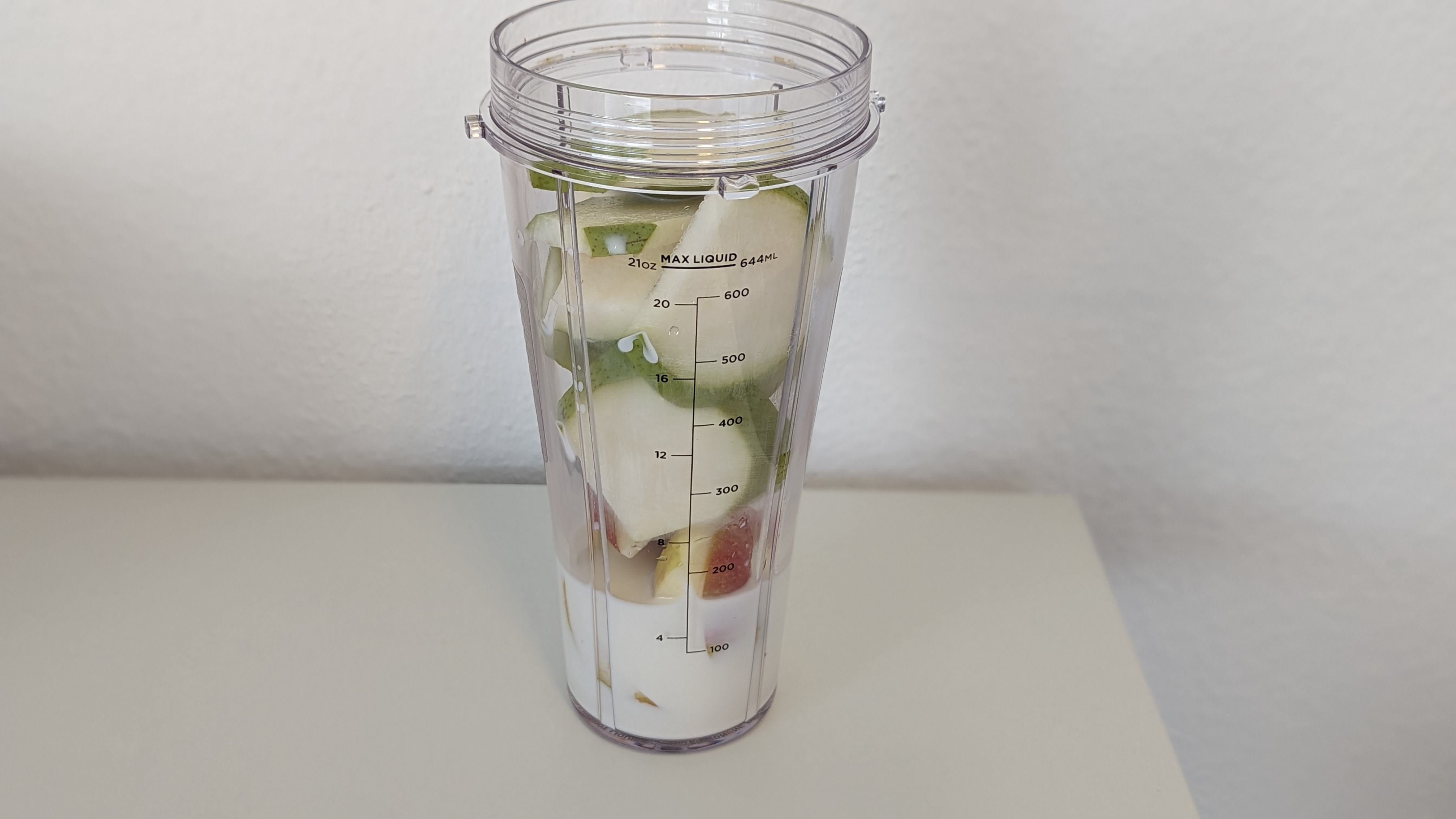 Danach bereiten wir einen Smoothie aus Äpfeln, Birnen sowie Mango und etwas Milch zu. Dazu nutzen wir den Nutri-Cup (700 Milliliter) im Blender-Modus und schneiden das Obst in grobe Stücke. Das Ergebnis ist auch hier überzeugend. Wir können keinerlei Stückchen im Behälter finden und erhalten ein sehr gleichmäßiges Ergebnis.
