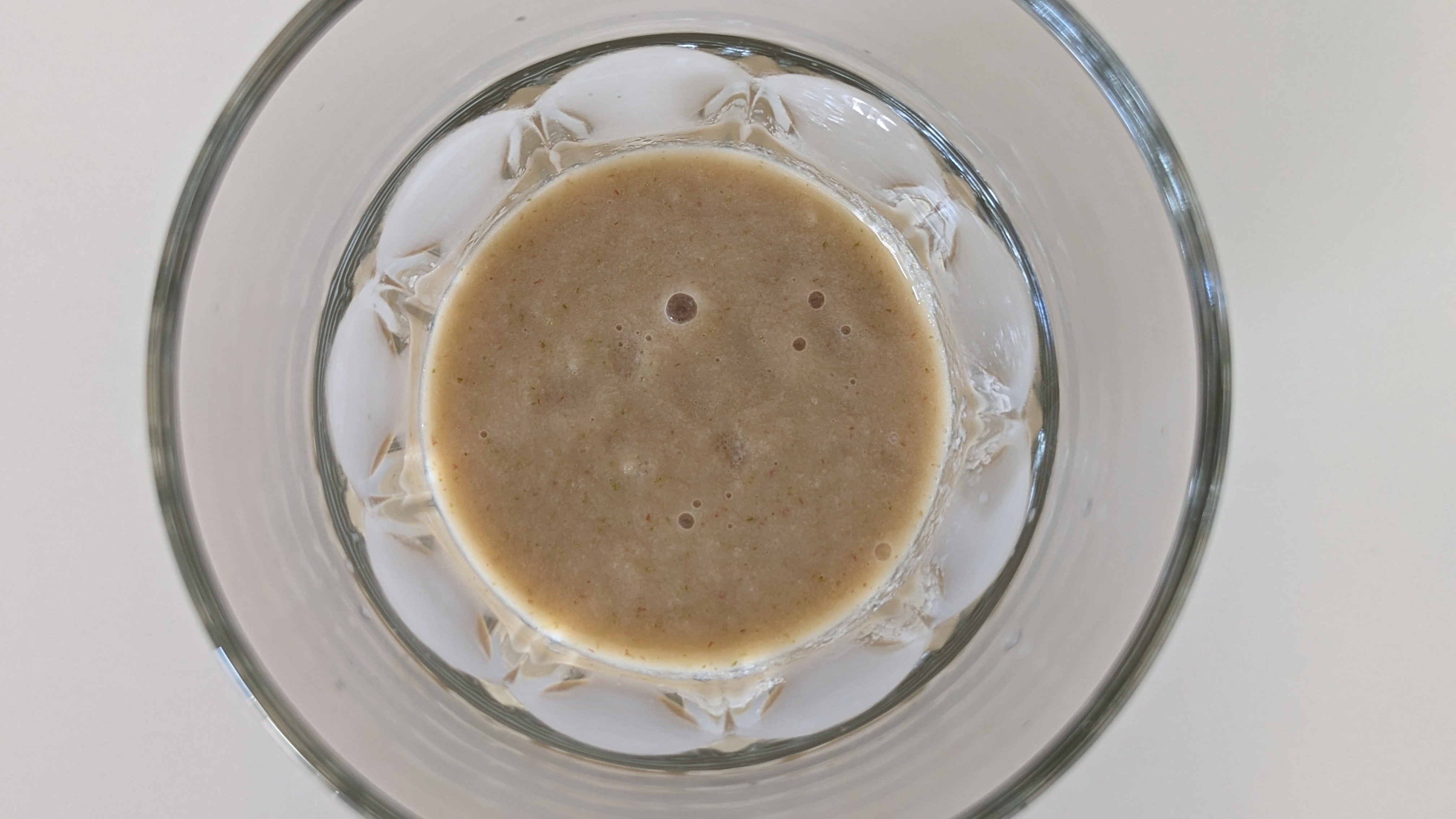 Der Ninja Foodi 3-in-1 Power Nutri Mixer verfügt über eine Leistung von maximal 1.200 Watt. Das ist ein überdurchschnittlicher Wert, der sich auch in unseren Ergebnissen darstellt. Wir starten den Test zunächst mit der Zubereitung eines Frucht-Sorbets. Dazu geben wir gefrorene Apfel-, Birnen und Mango-Stücke sowie eine Banane und 50 Milliliter Wasser in den Nutri-Becher. Dieser bietet ein Fassungsvermögen von 700 Millilitern. Für die Zubereitung nutzen wir die Mix-Funktion, die nach Betätigung der Start-Taste 60 Sekunden arbeitet. Dies gilt auch für die anderen automatischen Programme. Das Ergebnis ist ein cremiges Sorbet, das keine Stückchen enthält und einen vollmundigen Geschmack hinterlässt.