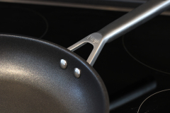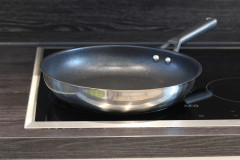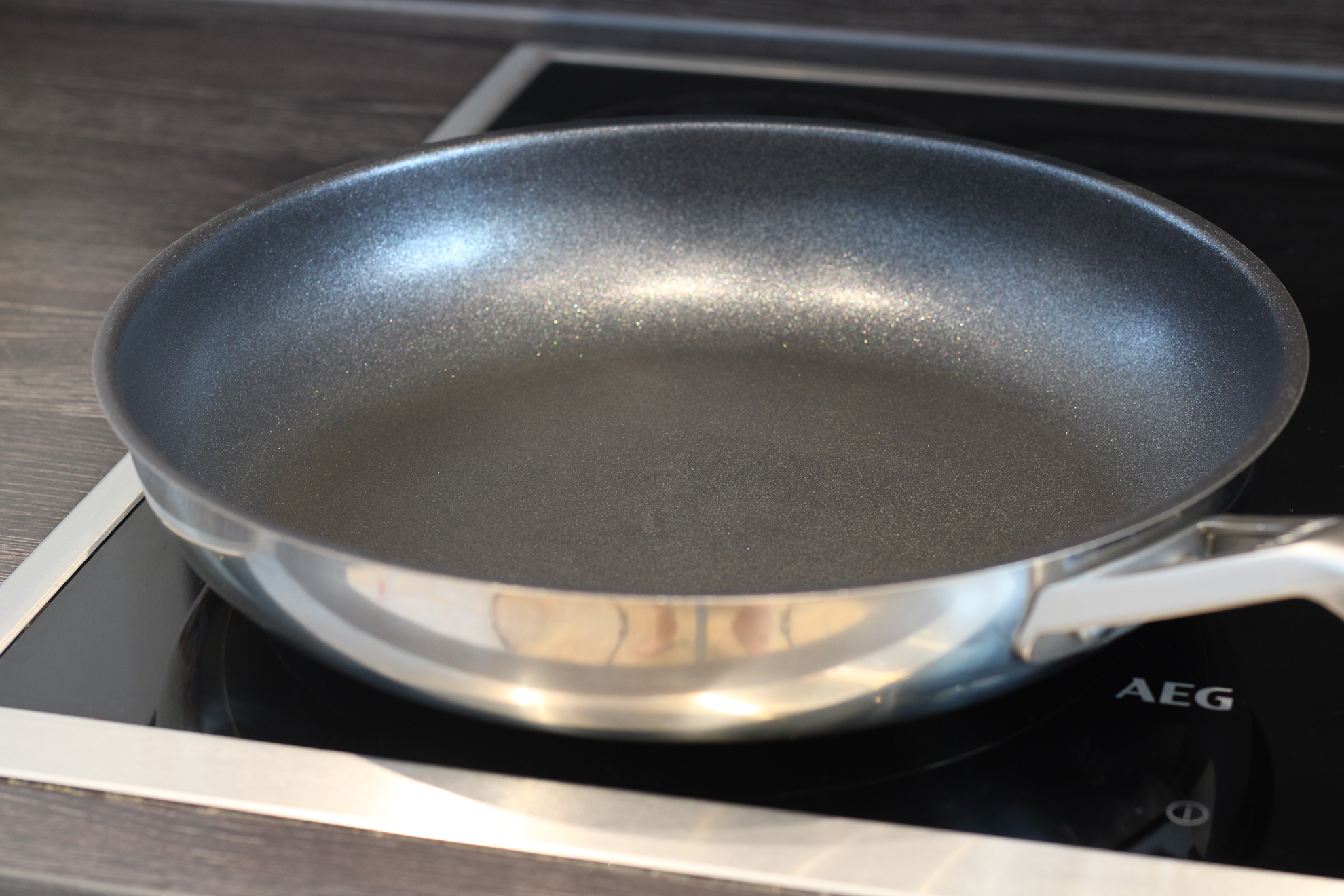 Die Pfanne, die uns zum Test zur Verfügung steht, hat einen Durchmesser von 28 Zentimeter und bietet somit viel Platz zum Anbraten. Sie kommt ohne Deckel, diesen hätten wir uns jedoch als Spritzschutz für einige Gerichte gewünscht. Pfanne und Stiel sind aus Edelstahl gefertigt, das Innere ist mit einer besonders dicken Antihaftbeschichtung ausgekleidet. Wie auch schon bei den Töpfen ist die Verarbeitung erstklassig. Wir entdecken keine Unsauberkeiten oder scharfe Kanten. Der Stiel ist mit zwei Nieten sicher an der Pfanne befestigt, die gewählten Materialien sind hochwertig. Das Design der Pfanne ist zwar schlicht, gefällt uns aber.