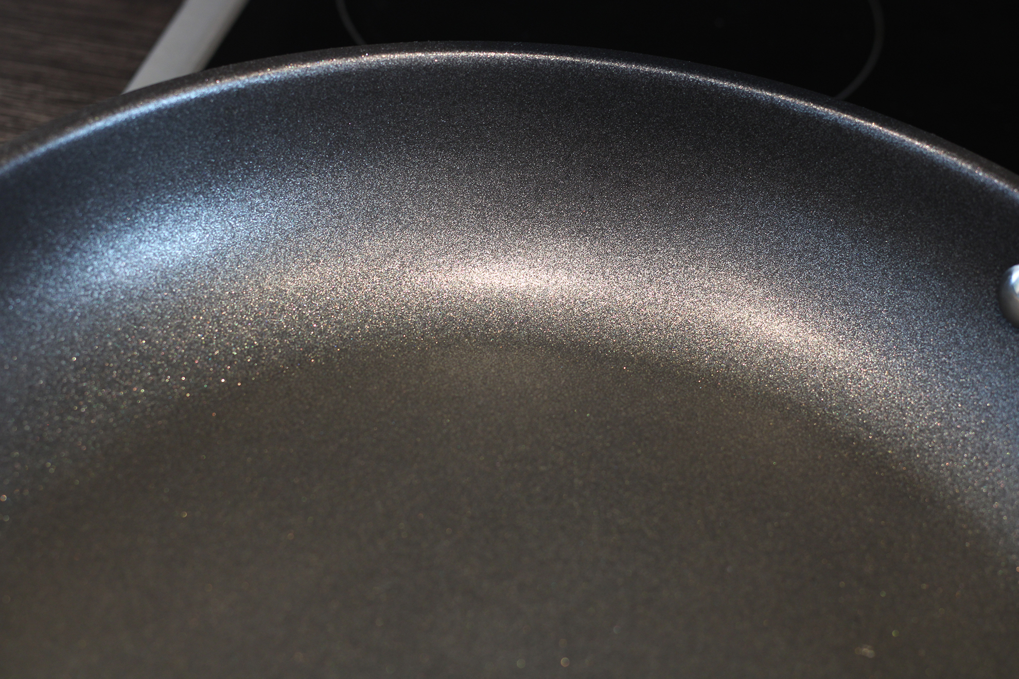 Die Pfanne, die uns zum Test zur Verfügung steht, hat einen Durchmesser von 28 Zentimeter und bietet somit viel Platz zum Anbraten. Sie kommt ohne Deckel, diesen hätten wir uns jedoch als Spritzschutz für einige Gerichte gewünscht. Pfanne und Stiel sind aus Edelstahl gefertigt, das Innere ist mit einer besonders dicken Antihaftbeschichtung ausgekleidet. Wie auch schon bei den Töpfen ist die Verarbeitung erstklassig. Wir entdecken keine Unsauberkeiten oder scharfe Kanten. Der Stiel ist mit zwei Nieten sicher an der Pfanne befestigt, die gewählten Materialien sind hochwertig. Das Design der Pfanne ist zwar schlicht, gefällt uns aber.