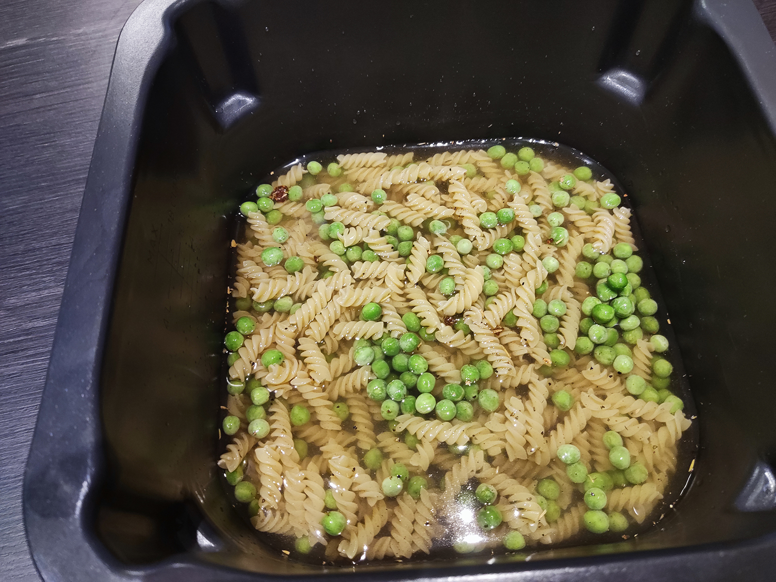 Eine typische Speedi Meal zubereitung. Nudeln, Reis und Co., etwas Wasser und Tiefkühlgemüse. (Foto: Testsieger.de)