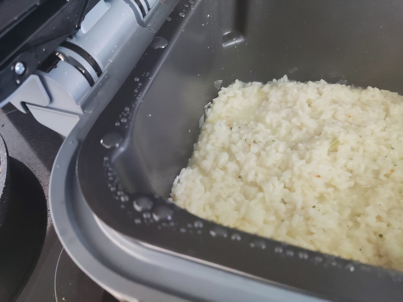 Trotzdem erweist sich die Anbratfunktion als sehr praktisch, wie wir bei der Zubereitung von Safran Risotto aus dem Rezeptbuch merken. Wir bereiten das gesamte Gericht im Multikocher zu und können den Herd kalt lassen. Zunächst braten wir den Risotto-Reis in etwas Butter an. Danach legen wir den Schalter um und wählen Dampfgaren. Bereits nach kurzer Zeit können wir uns über ein sehr schönes Risotto freuen. Ohne den Cook & Crisp-Einsatz lassen sich auch deutlich größere Portionen zubereiten.