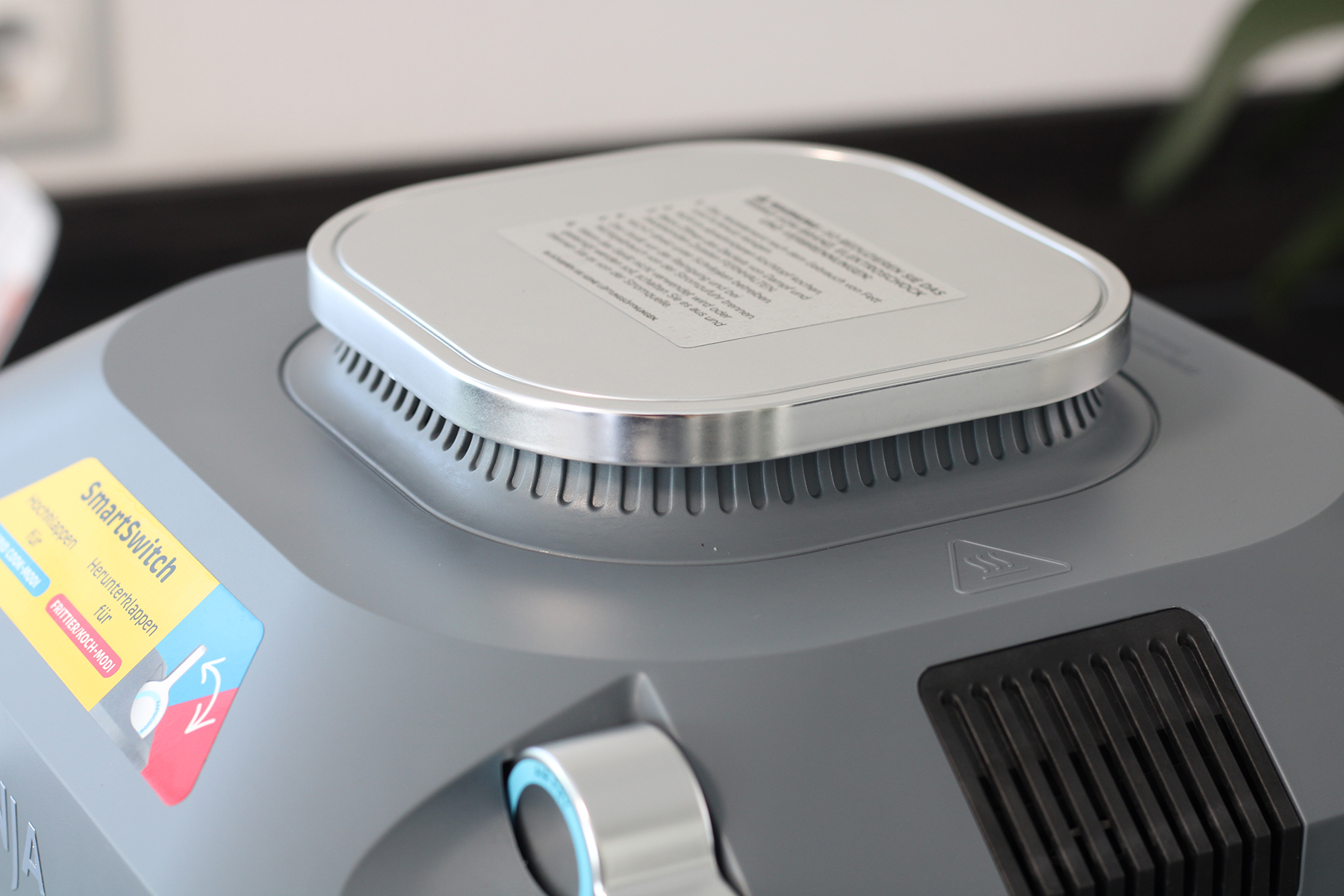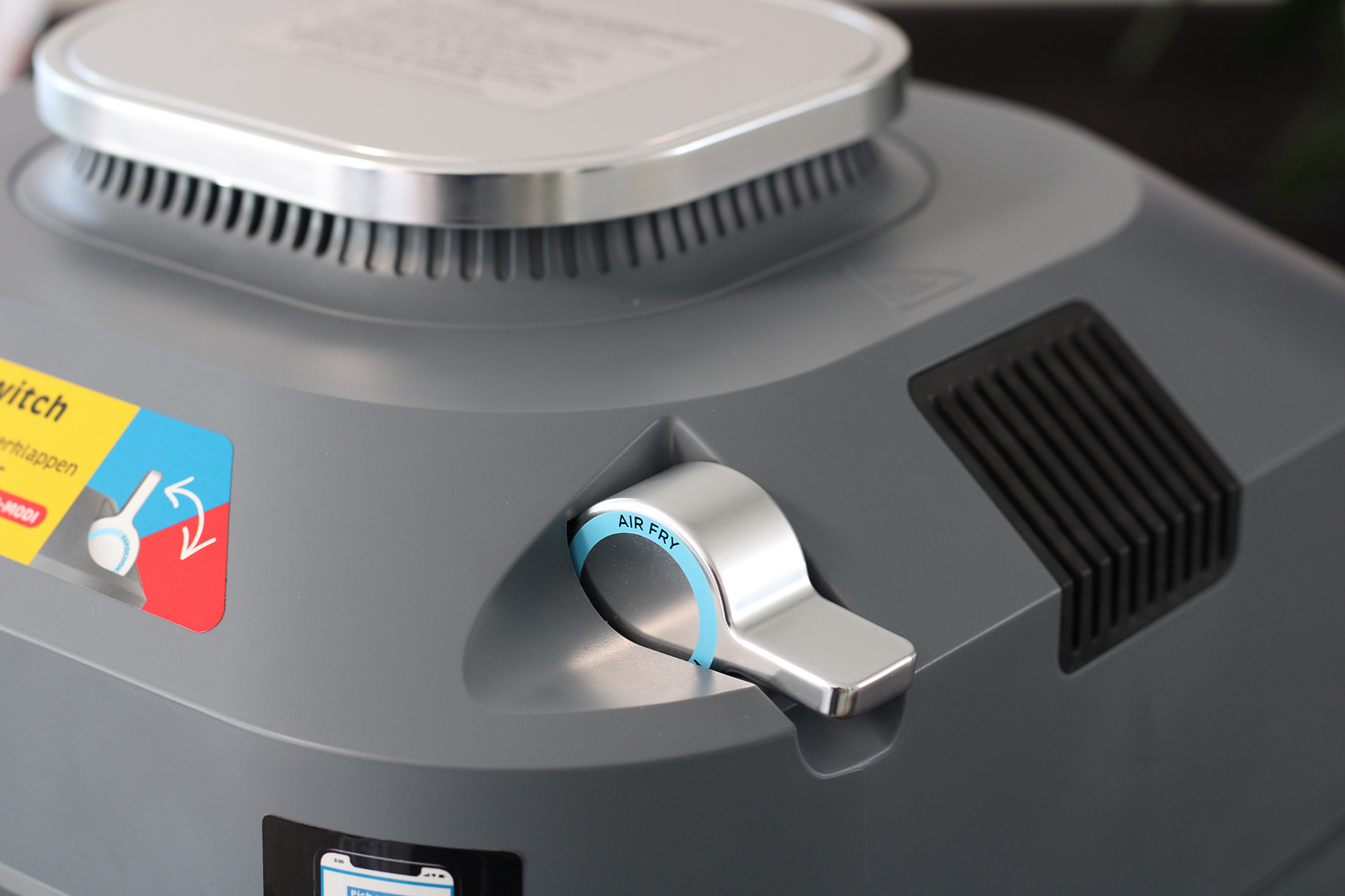 Ein markanter silberfarbener Hebel auf der rechten Seite des Deckels ermöglicht den Wechsel zwischen den beiden Funktionen. Steht er nach oben, befinden wir uns im Multikocher-Bereich. Zeigt er nach rechts, können wir heißluftfrittieren.