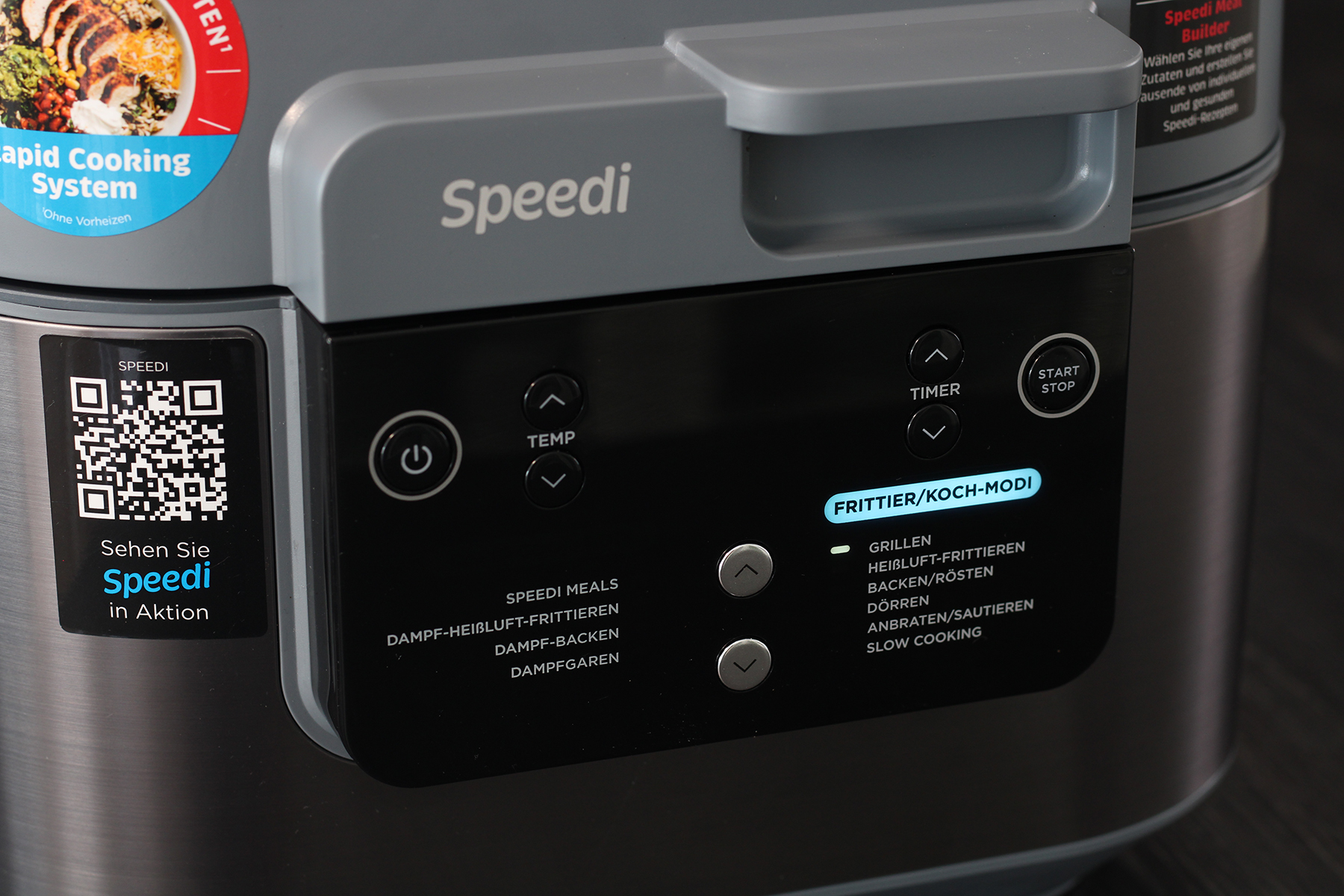 Die Bedienung erfolgt fast komplett über das Panel auf der Frontseite. Die Kombination aus physischen Tasten mit dem alphanumerischen Display funktioniert gut. Die Knöpfe haben einen angenehmen Druckpunkt und wir stellen keine Fehleingaben fest. Über die silberfarbenen Pfeiltasten schalten wir zwischen den verschiedenen Zubereitungsvarianten durch. Auf der linken Seite sind die Multikocher-Zubereitungen aufgelistet, auf der rechten die Heißluft-Varianten.