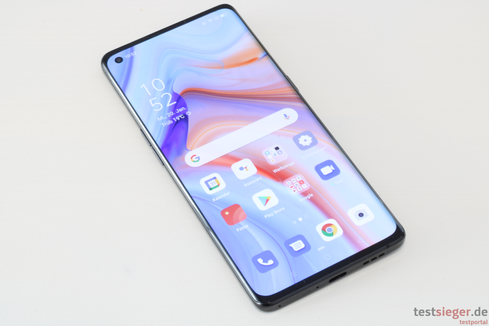 Das AMOLED-Display misst 6,5 Zoll in der Diagonale und löst mit 2.400 x 1.080 Pixel in Full-HD-Qualität auf. Dadurch ergibt sich ein Pixeldichte von 402 ppi. Damit ist das Ende der Fahnenstange zwar noch lange nicht erreicht, trotzdem überzeugt das Oppo Reno4 Pro insgesamt durch eine scharfe Darstellung. Selbst bei näherer Betrachtung erkennen wir keine Bildpunkte. Durch das 20:9-Format ist der Bildschirm im Vergleich zu 16:9-Displays in die Länge gezogen, wodurch er noch etwas imposanter wirkt. Bei 16:9-Videos müssen Nutzer dann allerdings mit schwarzen Balken an der linken und rechten Seite leben oder das Bild heranzoomen. Ein echtes Highlight ist die hohe Helligkeit. Diese erlaubt auch ein Ablesen bei direkter Sonneneinstrahlung, auch wenn sich die ein oder andere Spiegelung nicht vermeiden lässt. Hier spielt das Oppo sicher in der Oberklasse mit.