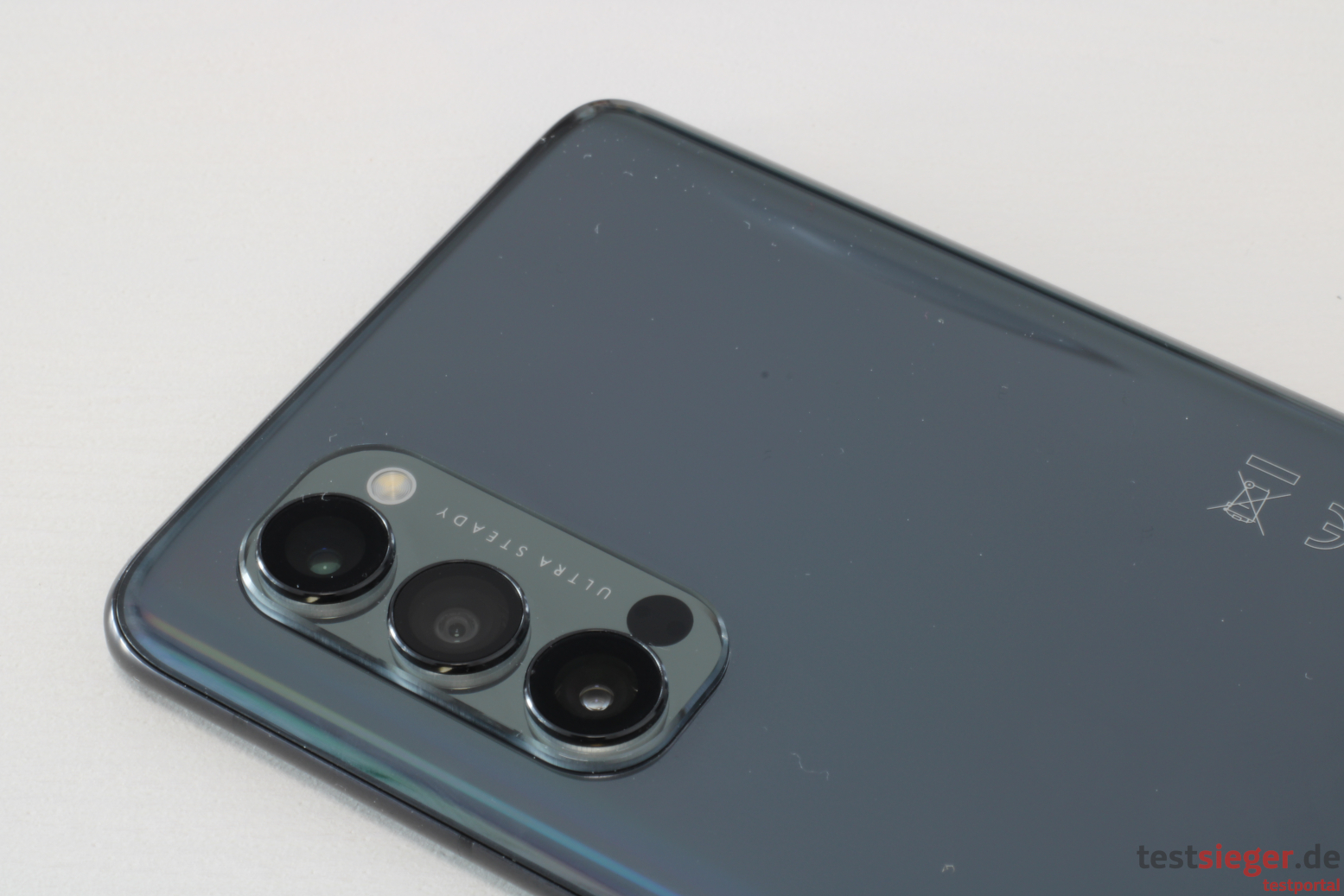 Das Oppo Reno4 Pro verfügt über eine Triple-Kamera. Die Hauptkamera löst mit 48 Megapixeln auf und verfügt über eine f/1.78-Blende. Hinzu kommen ein Tele-Objektiv mit 13 Megapixeln und f/2,4-Blende sowie eine 12-Megapixel-Weitwinkelkamera mit f/2,2-Blende. Gezoomt wird entweder 2-fach optisch oder 5-fach digital. Zur Unterstützung der Kamera sind ein optischer Bildstabilisator und ein Laser-Autofokus vorhanden.