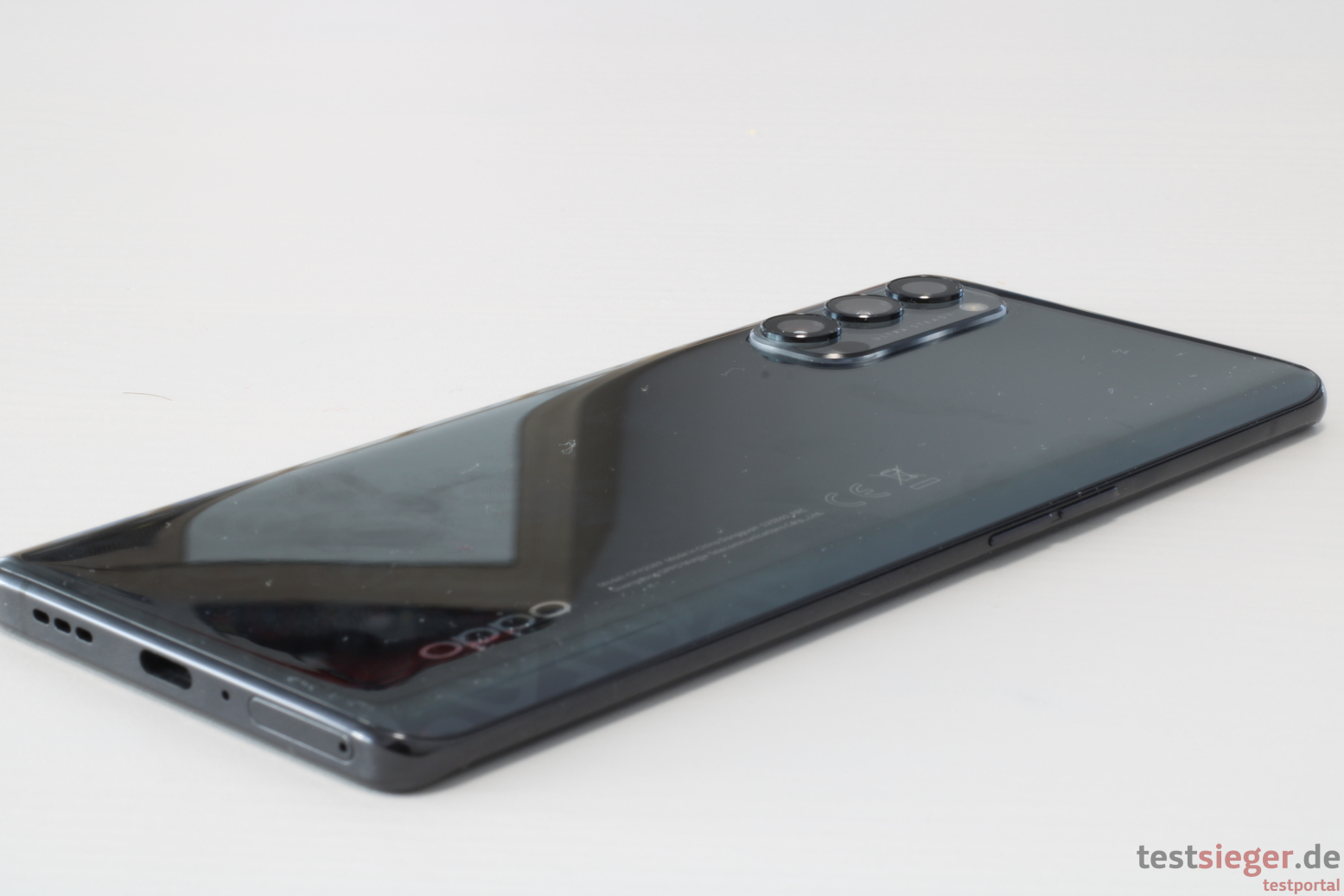Das Smartphone punktet durch eine stabile Bauweise. Bei Druck auf die Front- und Rückseite biegt sich das Handy keinen Millimeter durch. Knack- oder Knirschlaute hören wir ebenfalls nicht. Ein kleiner Kritikpunkt ist die IP54-Zertifizierung. Damit ist das Smartphone zwar gegen Spritzwasser und Staub geschützt, da das Oppo jedoch an der Oberklasse kratzt, hätte es ruhig etwas mehr sein dürfen. Gegen zeitweises Untertauchen ist das Smartphone beispielsweise nicht geschützt.