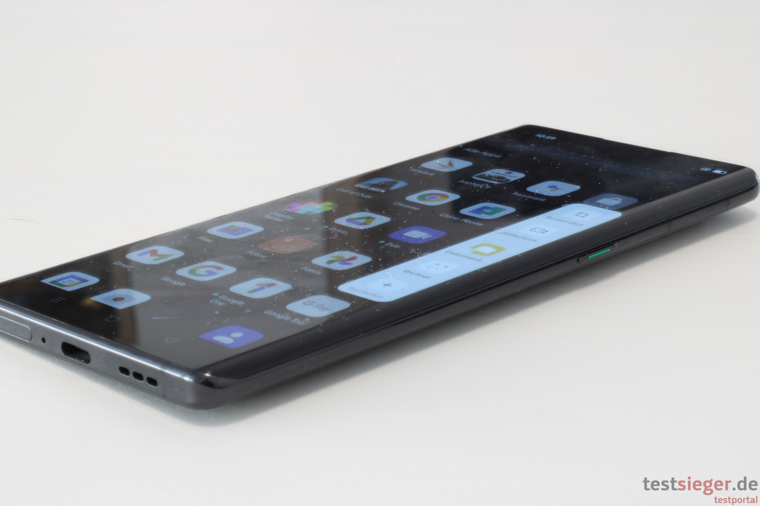 Oppo entscheidet sich für ein klassisches Tastenlayout mit Power-Button auf der rechten und Leit-Lause-Schalter auf der linken Seite. Alle drei Tasten sind sauber in das Gehäuse integriert, haben einen angenehmen Druckpunkt und reagieren zügig. Praktisch: Da sich alle Bedienelemente in etwa mittig befinden, ist auch mit kleineren Fingern eine Einhandbedienung möglich. Die Power-Taste ist doppelt belegt. Kurzes Drücken aktiviert den Google Assistant, längeres Halten aktiviert das Ausschalt-Menü. Das klappt in der Praxis sehr gut und intuitiv. Auf der Unterseite machen es sich der Dual-SIM-Slot, der USB-C-Anschluss, ein Mikrofon und der Lautsprecher gemütlich. Ein weiteres Mikrofon befindet sich auf der Oberseite. Der Fingerabdrucksensor befindet sich direkt im Display am unteren Rand. Er reagiert zwar leicht verzögert, aber meist zuverlässig. Letzteres gilt auch für die Gesichtserkennung.