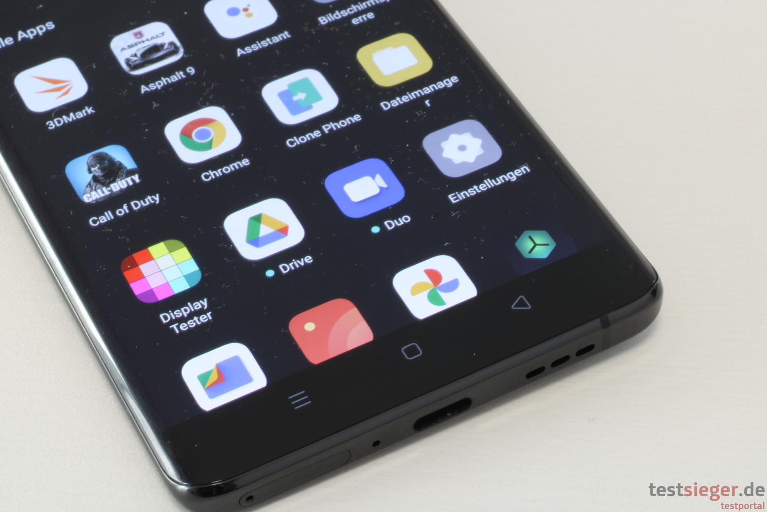 Oppo entscheidet sich für ein klassisches Tastenlayout mit Power-Button auf der rechten und Leit-Lause-Schalter auf der linken Seite. Alle drei Tasten sind sauber in das Gehäuse integriert, haben einen angenehmen Druckpunkt und reagieren zügig. Praktisch: Da sich alle Bedienelemente in etwa mittig befinden, ist auch mit kleineren Fingern eine Einhandbedienung möglich. Die Power-Taste ist doppelt belegt. Kurzes Drücken aktiviert den Google Assistant, längeres Halten aktiviert das Ausschalt-Menü. Das klappt in der Praxis sehr gut und intuitiv. Auf der Unterseite machen es sich der Dual-SIM-Slot, der USB-C-Anschluss, ein Mikrofon und der Lautsprecher gemütlich. Ein weiteres Mikrofon befindet sich auf der Oberseite. Der Fingerabdrucksensor befindet sich direkt im Display am unteren Rand. Er reagiert zwar leicht verzögert, aber meist zuverlässig. Letzteres gilt auch für die Gesichtserkennung.