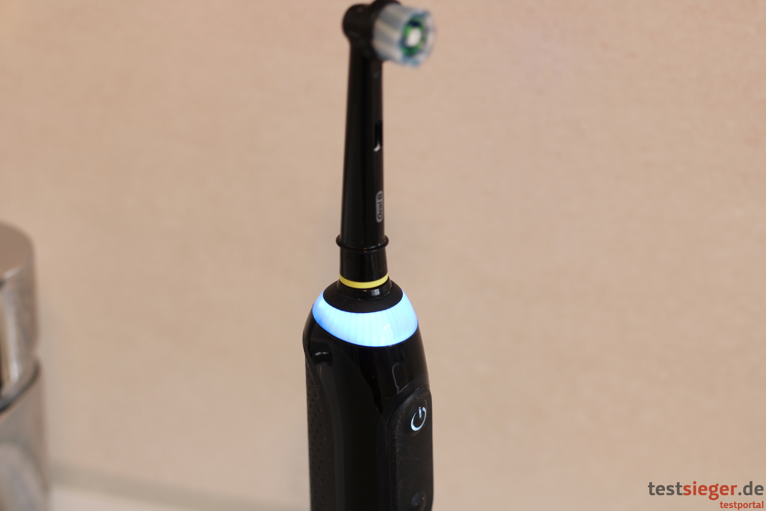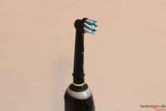 Die Putzergebnisse mit dem beiliegenden CrossAction-Aufsteckkopf können sich ebenfalls sehen lassen. Zudem bietet Oral B weitere Aufsätze etwa zur Tiefenreinigung oder zum Polieren an. Die Zähne fühlen sich nach Verwendung des normalen Putzmodus angenehm sauber an. Das bestätigt auch unser Plaque-Test. Nach der Reinigung sind alle eingefärbten Stellen verschwunden. Der Bürstenkopf hat eine angenehme Größe, was sich in der Praxis bezahlt macht. Er fühlt sich nicht sperrig an, ach wenn der Nutzer im Vergleich zu einer Schall-Variante den Mund bauartbedingt deutlich weiter öffnen. Mit einer Lärmbelästigung von 60 – 65 Dezibel (dBa) ist die Genius X sicherlich kein Leisetreter. Ein gewisser Geräuschpegel lässt sich bei einer rotierenden Elektrozahnbürste zwar nicht vermeiden, ein paar Dezibel weniger hätten es aber ruhig sein dürfen.
