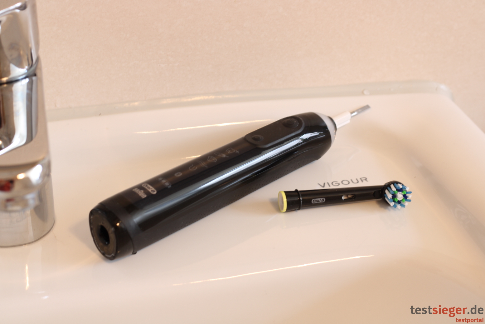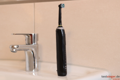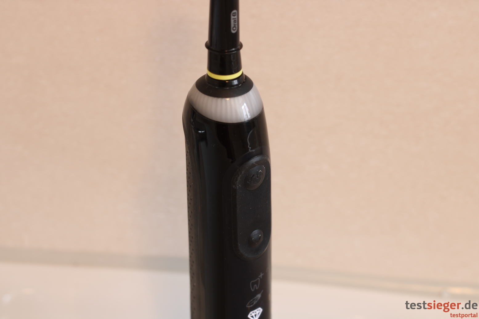 An den Verbindungsstellen der verschiedenen Komponenten finden wir keine Spaltmaße. Auch der wechselbare Bürstenkopf schließt optimal mit dem restlichen Gehäuse ab. Ein weiterer Pluspunkt: Weder die mattschwarze Gummierung noch der glänzende Kunststoff sind anfällig für Fingerabdrücke oder Kratzer. Unser einziger Mini-Kritikpunkt sind zwei Einkerbungen am Bürstenaufsatz, in welchen sich schnell Zahnpastareste sammeln. Mit aufgestecktem Kopf misst die Genius 24 Zentimeter in der Höhe, 3 Zentimeter in der Tiefe und 2,5 Zentimeter in der Breite und ist damit für eine elektrische Zahnbürste angenehm kompakt ausgefallen.