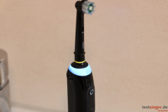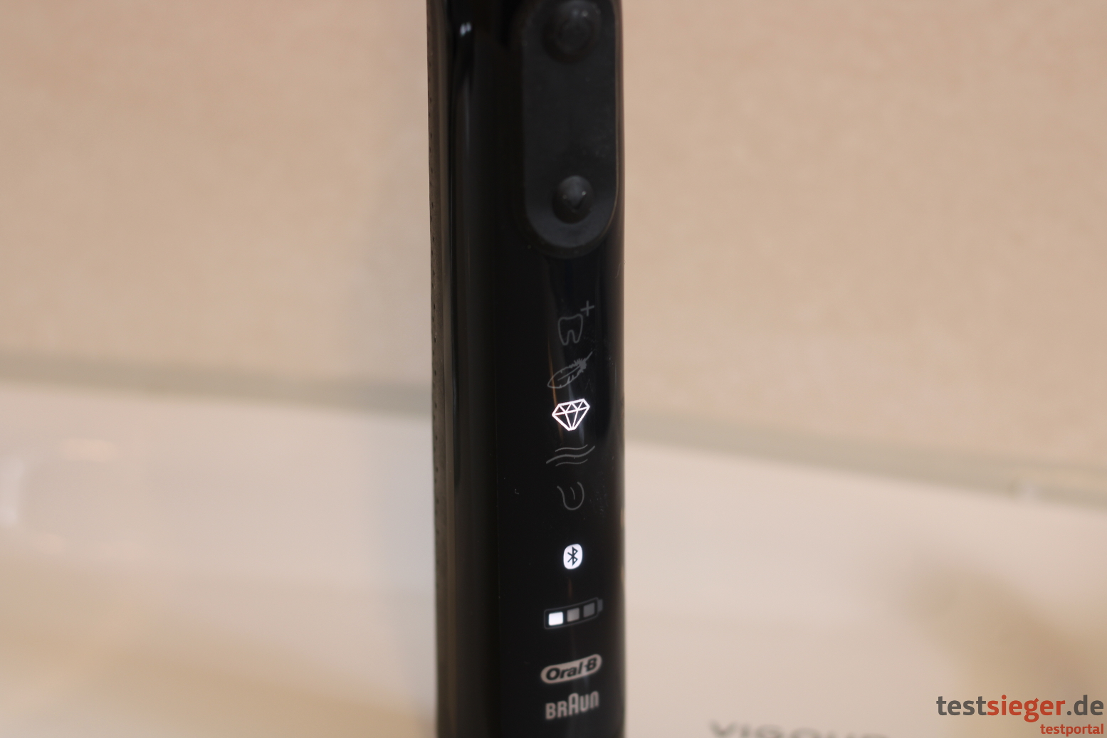 Beide Knöpfe haben einen angenehmen Druckpunkt und reagieren zügig. Einziger kleiner Kritikpunkt: Die fünf zusätzlichen Programme lassen sich nur bei eingeschalteter Zahnbürste und nicht schon vorher wählen. Damit der Nutzer jederzeit weiß, welche Modus gerade aktiv ist, verfügt die Genius X über fünf beleuchtete Symbole. Außerdem finden sich noch zwei Indikatoren für die Bluetooth-Funktion und den Akkuladestatus. Letzterer gliedert sich in drei Bereiche und ist daher recht ungenau. Für eine grobe Einordnung genügt es jedoch. Apropos Akku: Oral B gibt eine Laufzeit von bis zu zwei Wochen an. Diesen guten Wert können wir im Test in etwa bestätigen. Bis die Zahnbürste wieder voll geladen, vergehen knapp 12 Stunden. Hier gewinnt die Oral B keinen Blumentopf. Allerdings stellen wir – zumindest gefühlt – bei niedrigem Akku keinen Leistungsabfall fest.