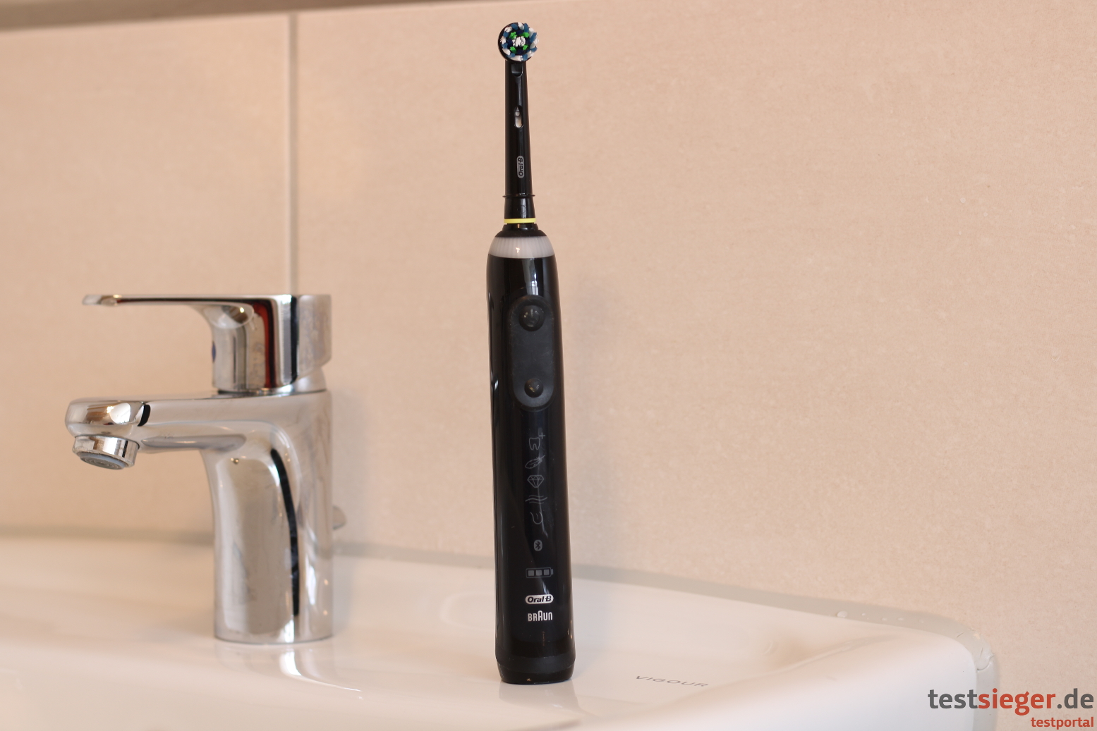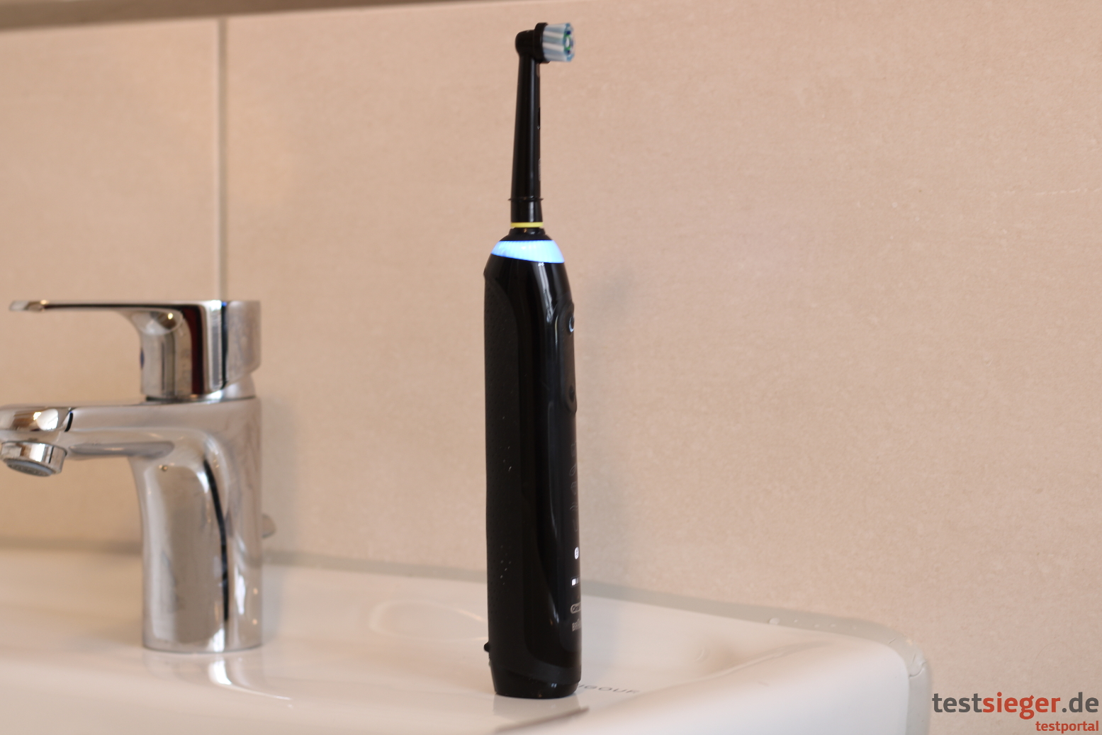 An den Verbindungsstellen der verschiedenen Komponenten finden wir keine Spaltmaße. Auch der wechselbare Bürstenkopf schließt optimal mit dem restlichen Gehäuse ab. Ein weiterer Pluspunkt: Weder die mattschwarze Gummierung noch der glänzende Kunststoff sind anfällig für Fingerabdrücke oder Kratzer. Unser einziger Mini-Kritikpunkt sind zwei Einkerbungen am Bürstenaufsatz, in welchen sich schnell Zahnpastareste sammeln. Mit aufgestecktem Kopf misst die Genius 24 Zentimeter in der Höhe, 3 Zentimeter in der Tiefe und 2,5 Zentimeter in der Breite und ist damit für eine elektrische Zahnbürste angenehm kompakt ausgefallen.