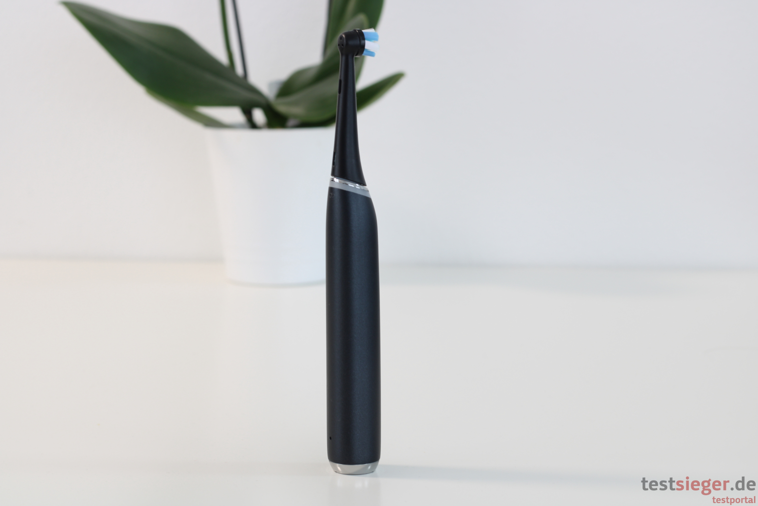 Eine gummierte Rückseite für einen besseren Halt spart sich Oral-B. Das ist nicht weiter schlimm, die Zahnbürste liegt trotzdem gut in der Hand, auch wenn sie gerade mit nassen Fingen oder unter der Dusche leicht rutschig wird. Das gleiche gilt für die Unterseite. Diese muss ebenfalls ohne Antirutschelemente auskommen. Dementsprechend leicht lässt sich die Zahnbürste auf glattem Untergrund verschieben und sie fällt selbst bei der kleinsten Berührung um. Es empfiehlt sich daher, sie auf der magnetischen Ladestation zu belassen, auch wenn diese gerade nicht am Stromnetz hängt. Hier ist der Halt ungleich besser.