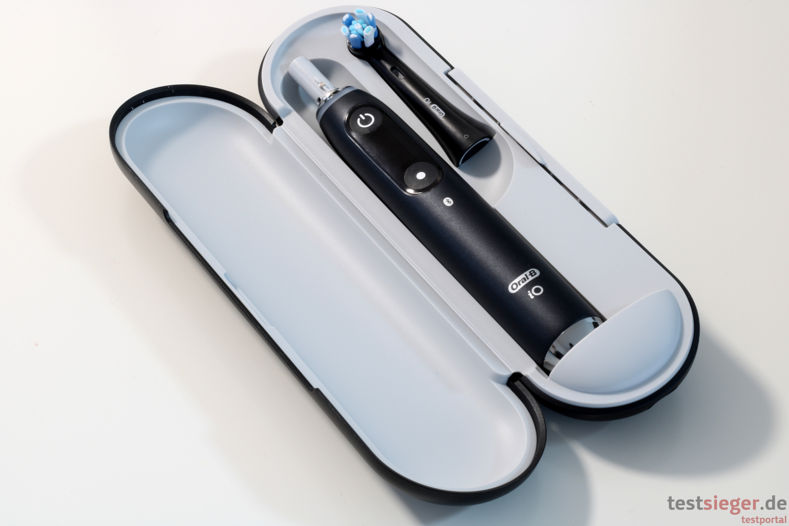 Der Lieferumfang ist nahezu vorbildlich. So befindet sich bereits ein Reiseetui aus Hartplastik in der Verpackung, das die Zahnbürste und einen Bürstenkopf auf Reisen schützt und sicher verwahrt. Praktisch: Mithilfe des beiliegenden Stromkabels verwandelt sich das Case in eine mobile Ladeschale. Die eigentliche Ladestation muss somit nicht unbedingt mit in den Koffer. Außerdem freuen sich Käufer über eine zusätzliche Aufbewahrungsbox für zwei Bürstenköpfe. Allerdings legt Oral-B nur eine Putzeinheit bei, was gerade in Anbetracht des hohen Anschaffungspreises etwas unverständlich ist.