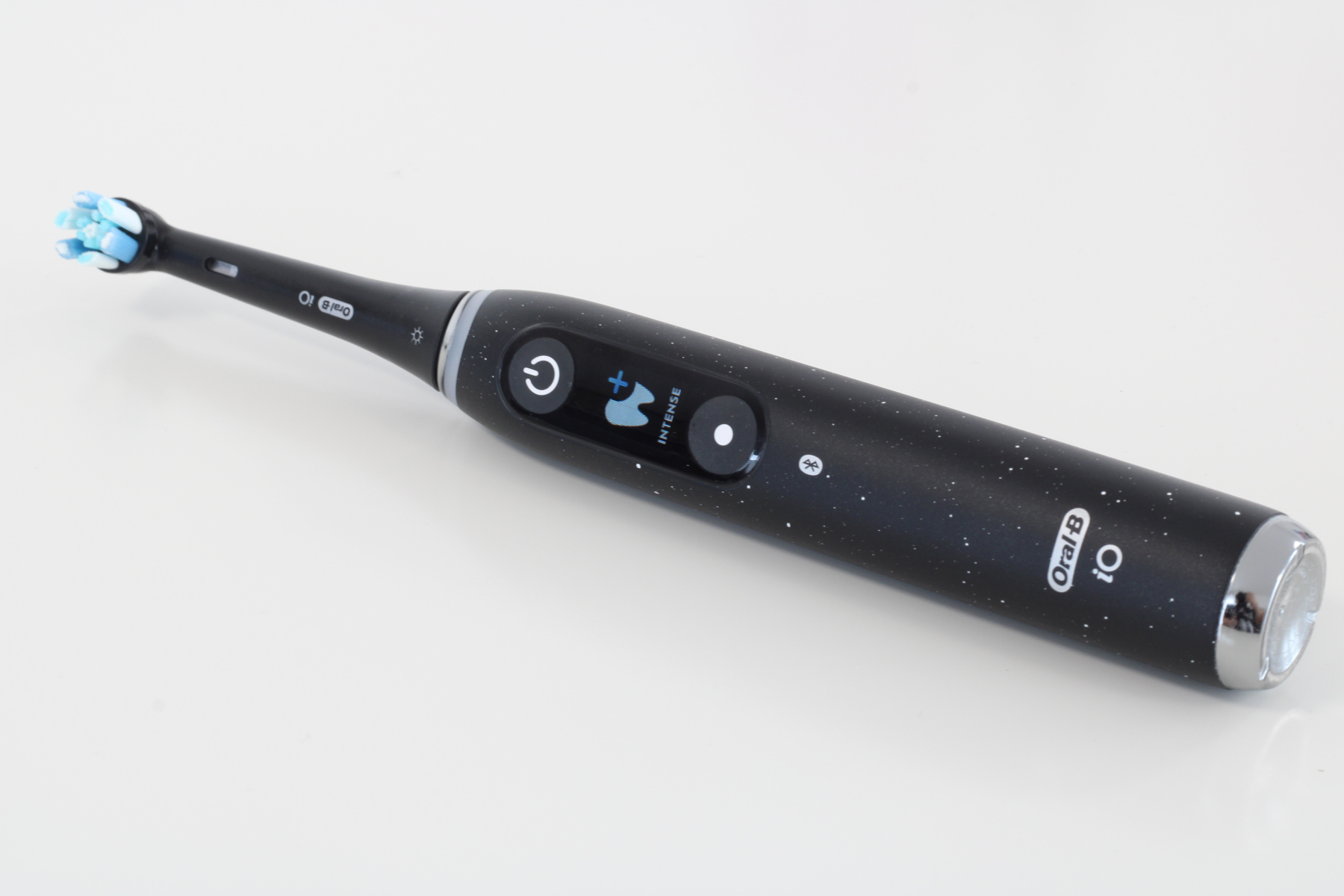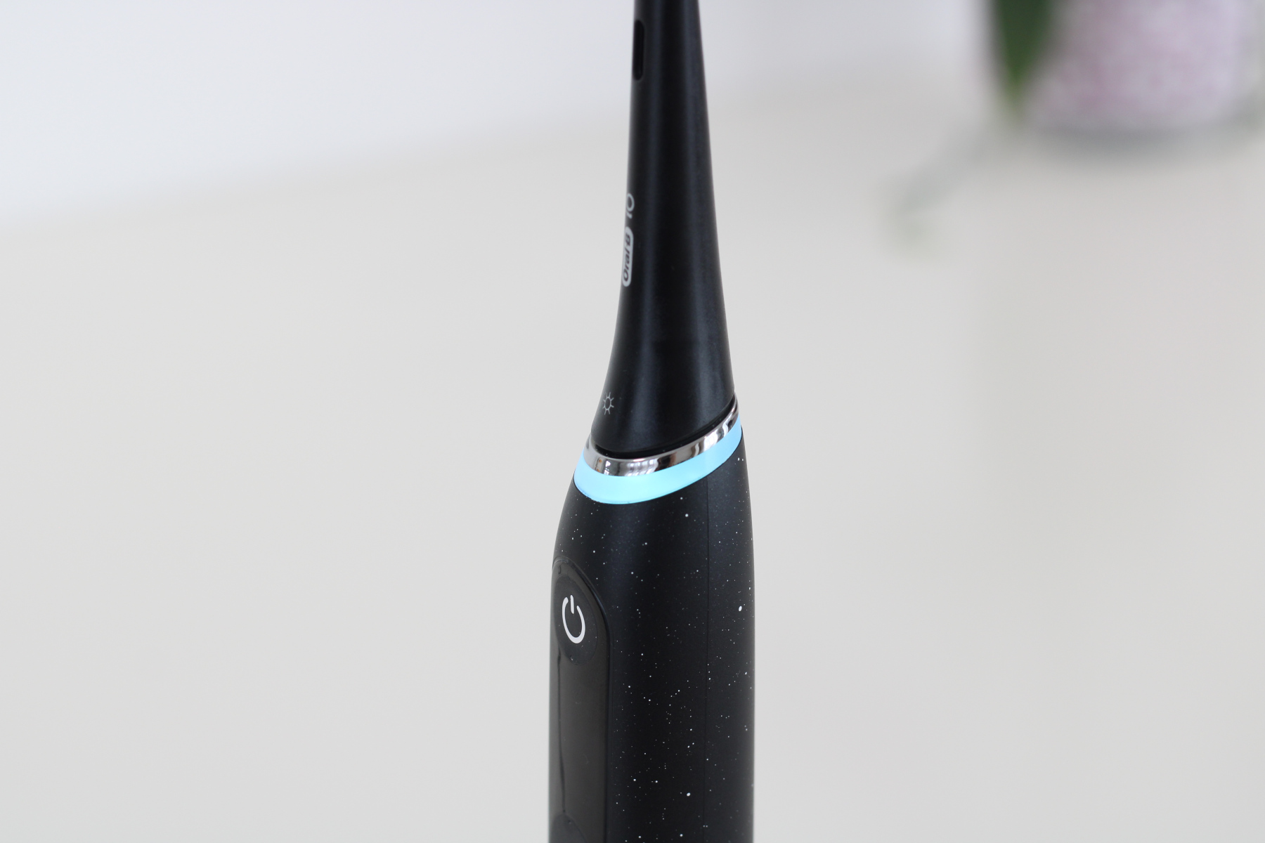 Das Kunststoffgehäuse überzeugt durch eine gute Verarbeitungsqualität. Es besteht aus einem Guss und das verwendete Material ist robust. Selbst unter hohem Druck können wir es nicht verbiegen oder verformen. Es ist also kein Problem, wenn Nutzerinnen und Nutzer sie einmal versehentlich auf den Badezimmerboden fallen lassen. Die Bedieneinheit samt Display und zwei Tasten ist perfekt in das restliche Gehäuse eingearbeitet. Gerade an solchen Details erkennt man ein Premium-Produkt. Wir haben jedoch den gleichen Kritikpunkt wie bei der iO 9: Der Spalt zwischen Motoreinheit und Bürstenaufsatz ist recht groß. Hier sammeln sich zügig Zahnpastarückstände. Das tritt bei anderen elektrischen Zahnbürsten zwar auch auf, doch gerade hier erwarten wir uns etwas mehr.