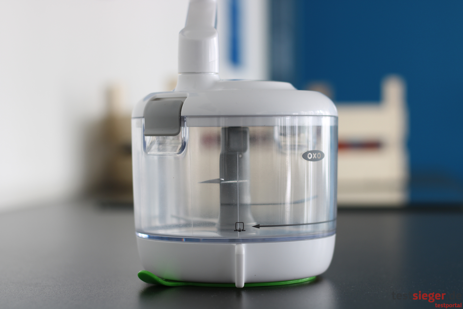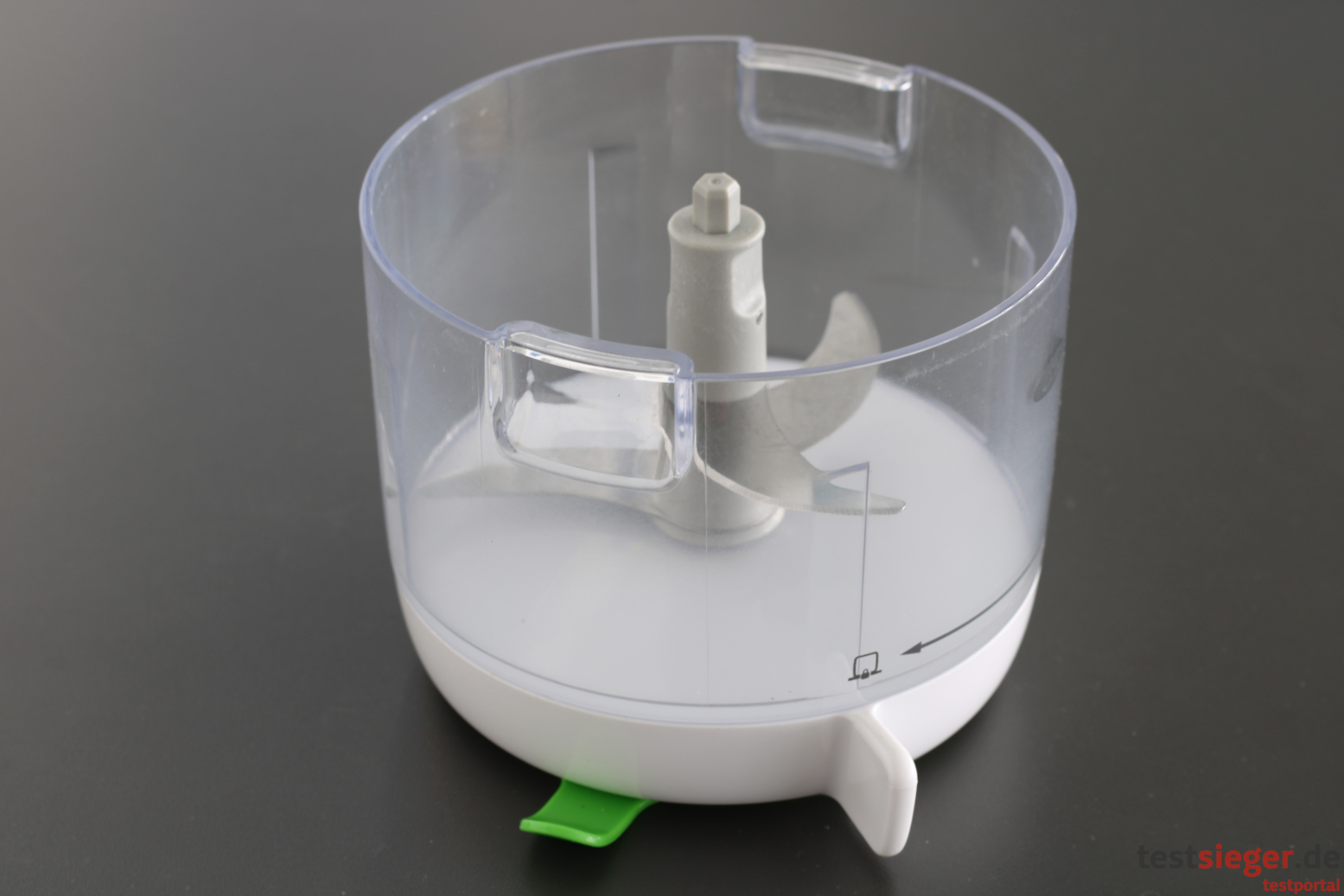 Was uns im Praxistest direkt negativ auffällt: Die Konstruktion des Saugnapfs ist zwar als nützliche Arbeitserleichterung gedacht, erfüllt ihren Zweck in der praktischen Anwendung jedoch nicht. Bedienen wir die Küchenmaschine in befülltem Zustand, lässt die Saugkraft des Napfes rasch nach und die Konstruktion gerät ins Rutschen. So sind wir gezwungen, den Zerkleinerer mit einer Hand festzuhalten und mit der anderen Hand die Kurbel gleichzeitig im Uhrzeigersinn zu drehen – nicht sehr komfortabel.