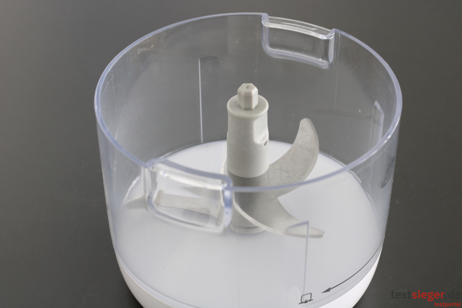 Was uns im Praxistest direkt negativ auffällt: Die Konstruktion des Saugnapfs ist zwar als nützliche Arbeitserleichterung gedacht, erfüllt ihren Zweck in der praktischen Anwendung jedoch nicht. Bedienen wir die Küchenmaschine in befülltem Zustand, lässt die Saugkraft des Napfes rasch nach und die Konstruktion gerät ins Rutschen. So sind wir gezwungen, den Zerkleinerer mit einer Hand festzuhalten und mit der anderen Hand die Kurbel gleichzeitig im Uhrzeigersinn zu drehen – nicht sehr komfortabel.