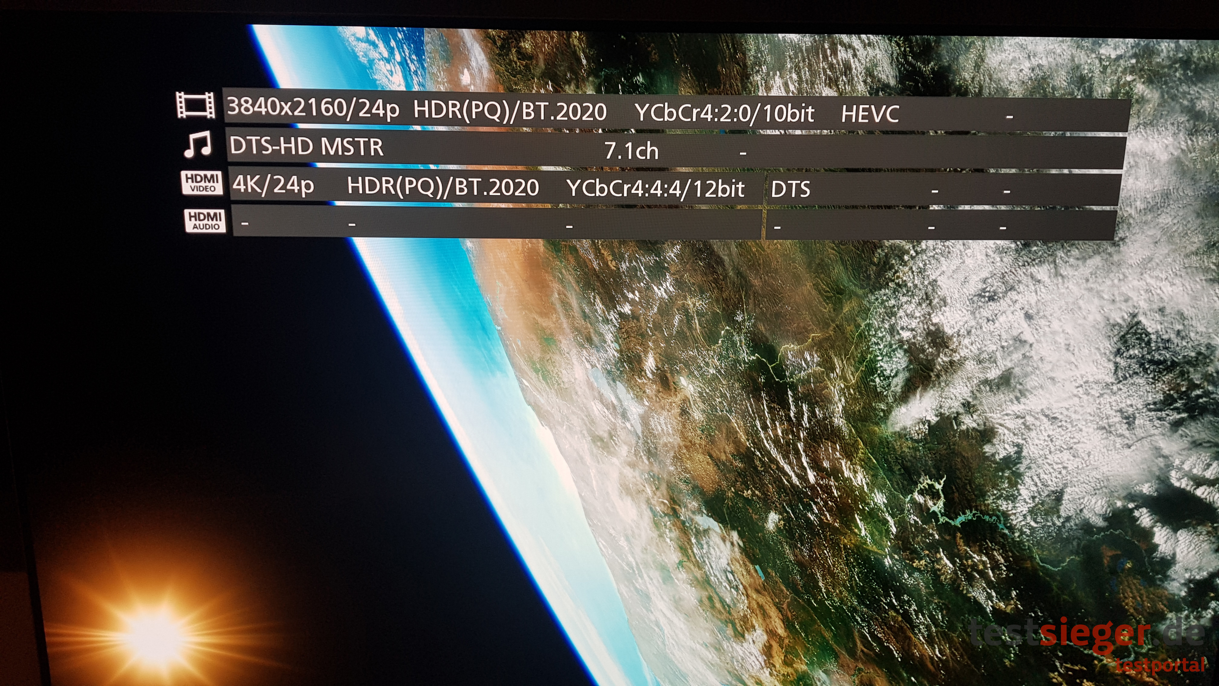Obendrein erlaubt der Player umfangreiches Monitoring bei der Wiedergabe von Discs. Das zugehörige On-Screen-Menü bietet sowohl Informationen über das Ausgangsmaterial als auch die Ausgabe des Players. So macht er zum Beispiel deutlich, wenn zwar die UHD-Disc HDR und den UHD-Farbraum BT.2020 unterstützt, der Player aufgrund der Fähigkeiten des AV-Receivers / Fernsehers aber nur SDR und den HD-Farbraum BT.709 ausgibt. Hier fällt uns im Test ein kleiner Unterschied zum UB900 auf: Der Player erkennt bei einem unserer Testfernseher nicht den korrekten Farbraum. Das Gerät unterstützt zwar kein HDR, aber BT.2020 mit bis zu 12 Bit. Der UB824 gibt dennoch BT.709 aus, der Vorgänger erkennt das Zielformat korrekt.