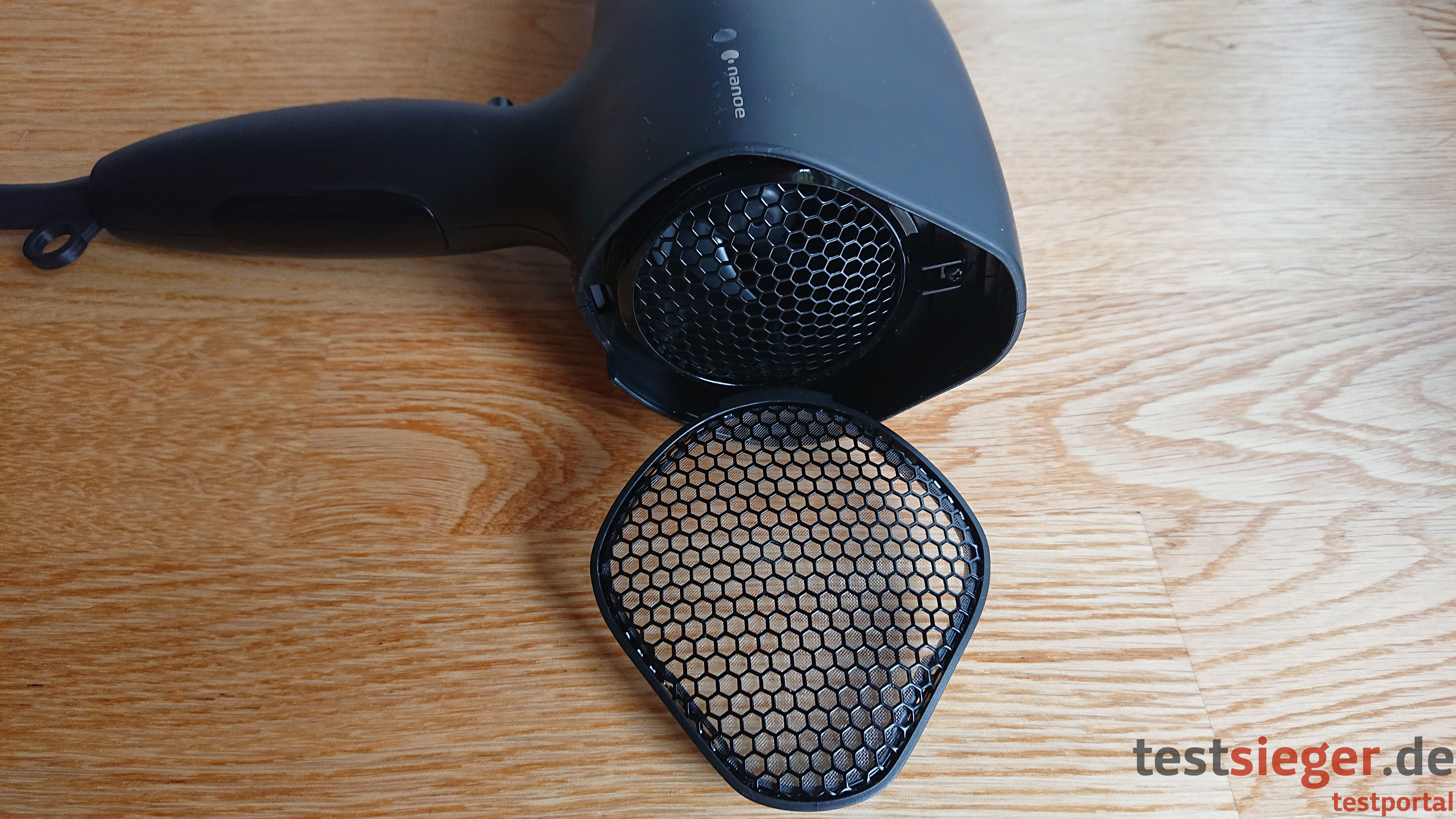 Oberhalb der beiden Regler befindet sich die Kaltstufe-Taste und unterhalb ein Aufhängering. Insgesamt liegt der Haartrockner gut in der Hand und ist nicht zu schwer. Der Lufteinlass mit Filter lässt sich zur Reinigung ganz einfach abnehmen. Der Hersteller empfiehlt Nutzerinnen und Nutzer den nanoe-Auslass sowie den Lufteinlass und Luftauslass regelmäßig zu säubern.