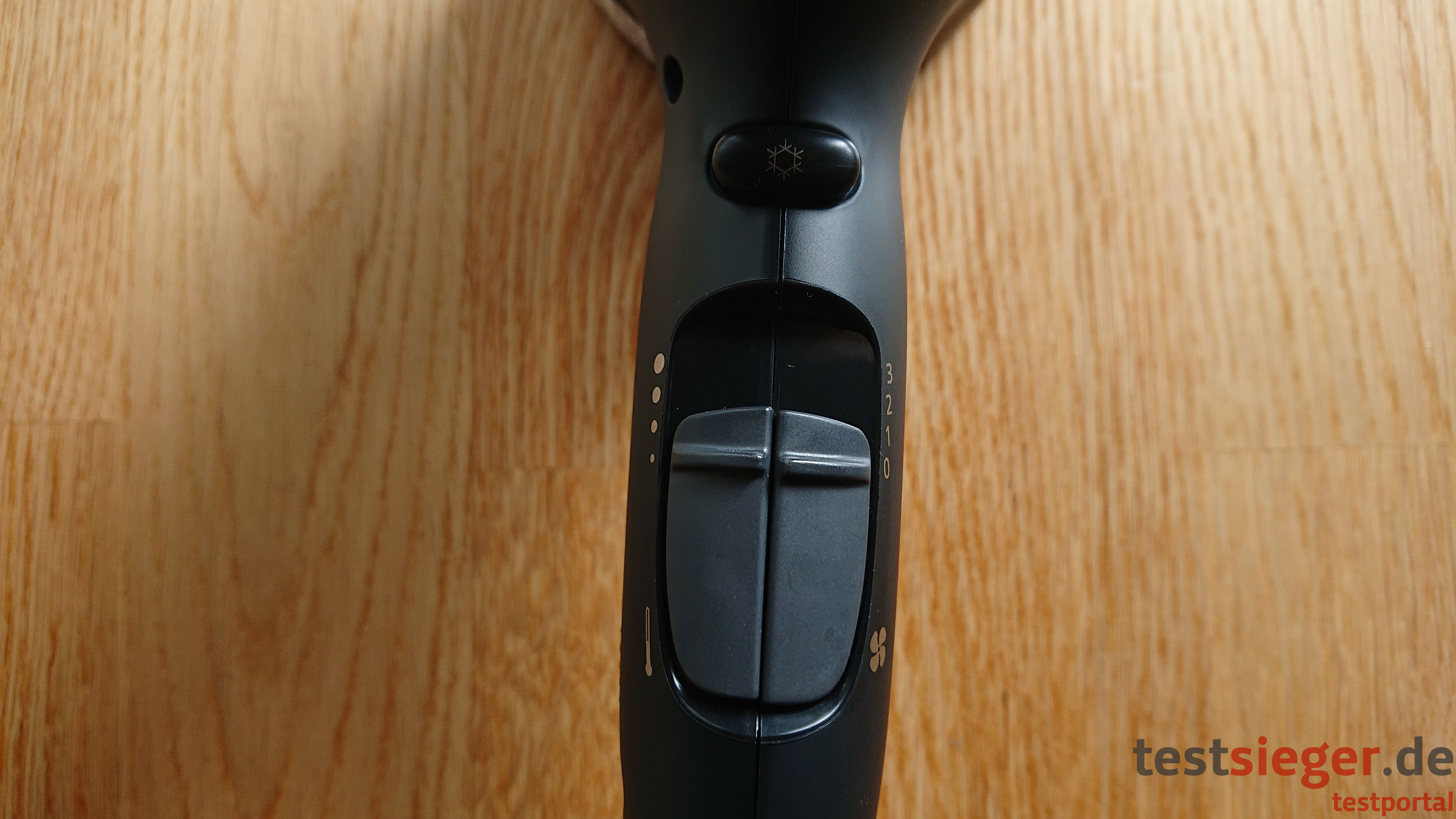 Am Griff finden sich zwei Schalter zum Regeln des Luftstroms und der Temperatur. Die Regler sind intuitiv in der Anwendung. Zudem haben lassen sie sich ganz locker verschieben, heißt der Druckpunkt ist hier sehr leicht, was recht komfortabel während dem Föhnen ist. Beim Luftstrom stehen vier Stufen zur Wahl, die mit Nummern gekennzeichnet sind: Turbo (sehr starker Luftstrom), Trocknen (starker Luftstrom), Legen (sanfter Luftstrom) und Aus. Bei den Temperaturen können vier Stufen ausgewählt werden: Heiß, Warm, Gesund (sanfte Luft) oder Kalt.