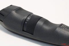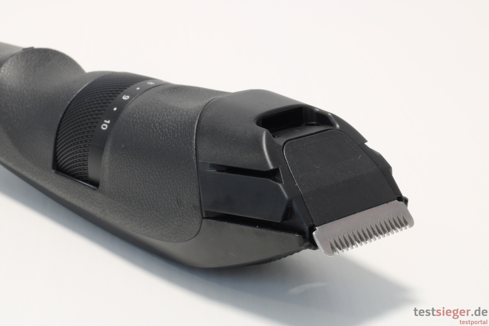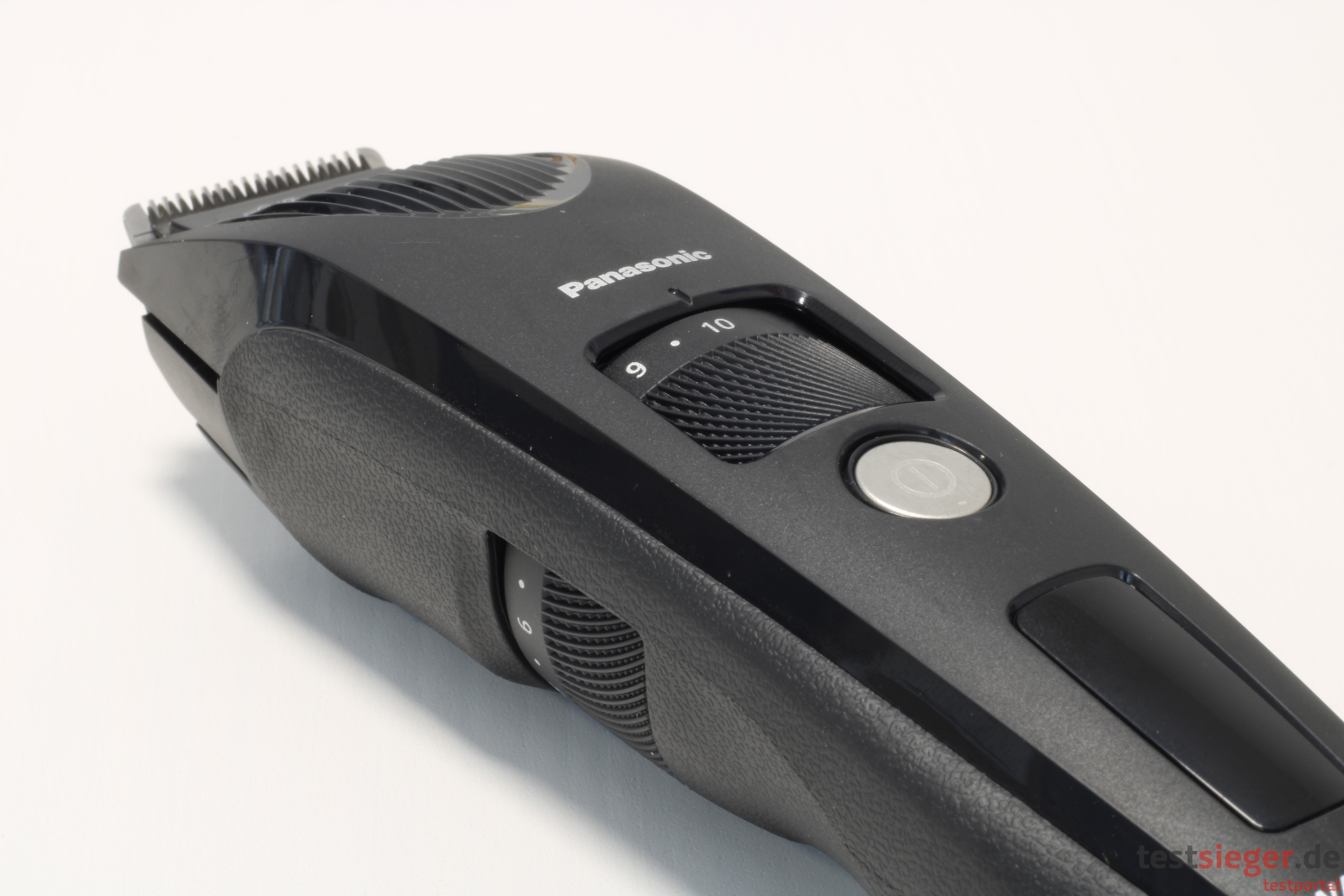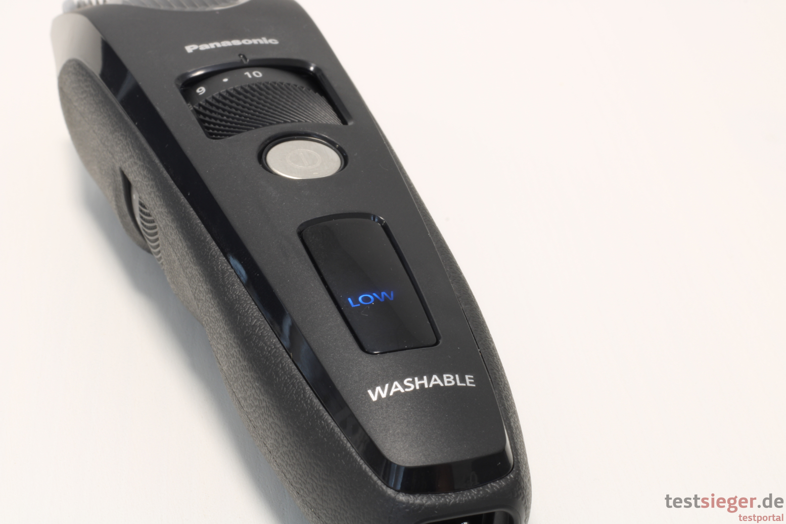 Die Bedienung ist nahezu selbsterklärend. Trotzdem legt Panasonic eine vorbildliche Bedienungsanleitung bei, die alle Funktionen wie Reinigung oder Aufladen im Detail beschreibt. Die Start-Stop-Taste liegt mittig auf der Vorderseite, punktet durch einen angenehmen Druckpunkt und lässt sich problemlos mit dem Daumen der rechten oder linken Hand erreichen. Direkt darüber liegt das Wahlrad für die Schnittlänge. Diese lässt sich in 19 Stufen zwischen einem und zehn Millimetern anpassen. Ein Mechanismus schiebt den Kammaufsatz entsprechend nach oben und unten. Ohne Kammaufsatz trimmt der ER-SB40 auf circa 0,5 Zentimeter. Insgesamt bietet der Rasierer also 20 verschiedene Stufen. Der Aufsatz lässt sich sehr einfach und ohne Kraftaufwand abnehmen und genauso einfach wieder aufstecken. Durch einen Einklick-Mechanismus hält er fest am Gehäuse. Das Drehrad bietet bei jeder Stufe einen leichten Widerstand und rastet dann sauber ein. Somit steht einer präzisen Wahl nichts im Weg.