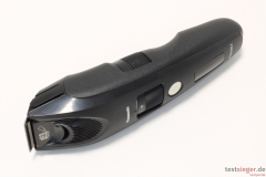 Die Handhabung stellt uns im Test vor keine größeren Hürden. An der Rückseite befindet sich eine Einkerbung für den kleinen und Ringfinger und eine Ablage für den Zeigfinger. In dieser Position fasst sich der Haarschneider für unser Verständnis sehr angenehm. Es ist aber nicht unbedingt nötig, dass der Nutzer die gleiche Fingerposition wählt. Durch die gummierte Rückseite bietet das Gerät einen angenehmen Halt – auch bei Verwendung unter der Dusche, was dank wasserfestem Gehäuse auch kein Problem ist. Dank des niedrigen Gewichts von knapp 180 Gramm belastet der Rasierer den Arm auch bei längeren Styling-Sessions nicht.
