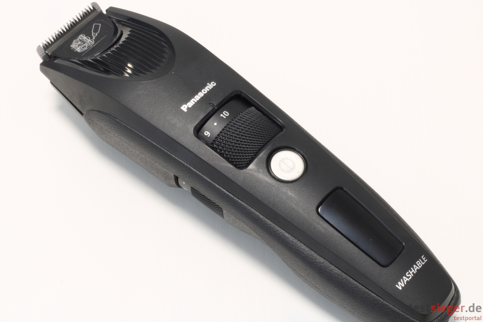 Die Bedienung ist nahezu selbsterklärend. Trotzdem legt Panasonic eine vorbildliche Bedienungsanleitung bei, die alle Funktionen wie Reinigung oder Aufladen im Detail beschreibt. Die Start-Stop-Taste liegt mittig auf der Vorderseite, punktet durch einen angenehmen Druckpunkt und lässt sich problemlos mit dem Daumen der rechten oder linken Hand erreichen. Direkt darüber liegt das Wahlrad für die Schnittlänge. Diese lässt sich in 19 Stufen zwischen einem und zehn Millimetern anpassen. Ein Mechanismus schiebt den Kammaufsatz entsprechend nach oben und unten. Ohne Kammaufsatz trimmt der ER-SB40 auf circa 0,5 Zentimeter. Insgesamt bietet der Rasierer also 20 verschiedene Stufen. Der Aufsatz lässt sich sehr einfach und ohne Kraftaufwand abnehmen und genauso einfach wieder aufstecken. Durch einen Einklick-Mechanismus hält er fest am Gehäuse. Das Drehrad bietet bei jeder Stufe einen leichten Widerstand und rastet dann sauber ein. Somit steht einer präzisen Wahl nichts im Weg.
