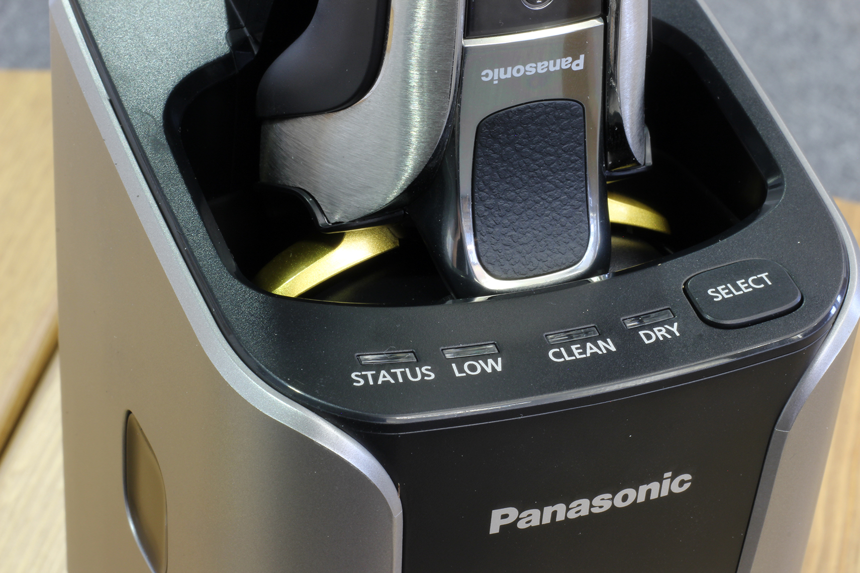 Praktischerweise hat Panasonic dem Rasierer noch einen Ultraschallreinigungsmodus spendiert. Dazu einfach etwas Flüssigseife auf die Scherfolien auftragen und den Modus durch zwei-sekündiges Drücken der Power-Taste starten. Nach der automatischen Reinigung in der Station startet die Trockenfunktion. Diese benötigt mit 180 Minuten allerdings sehr viel Zeit. Unserer Erfahrung nach, kann man diese nach 60 Minuten bereits stoppen. Zwei Tasten entriegeln die Scherfolien-Einheit und der Nutzer kann die darunter gefangenen Haare mit der mitgelieferten Reinigungsbürste entfernen. Mit einer durchschnittlichen Lautstärke von 60 Dezibel (dBA) im Betrieb ist der ES-LV9Q sicherlich kein Leisetreter