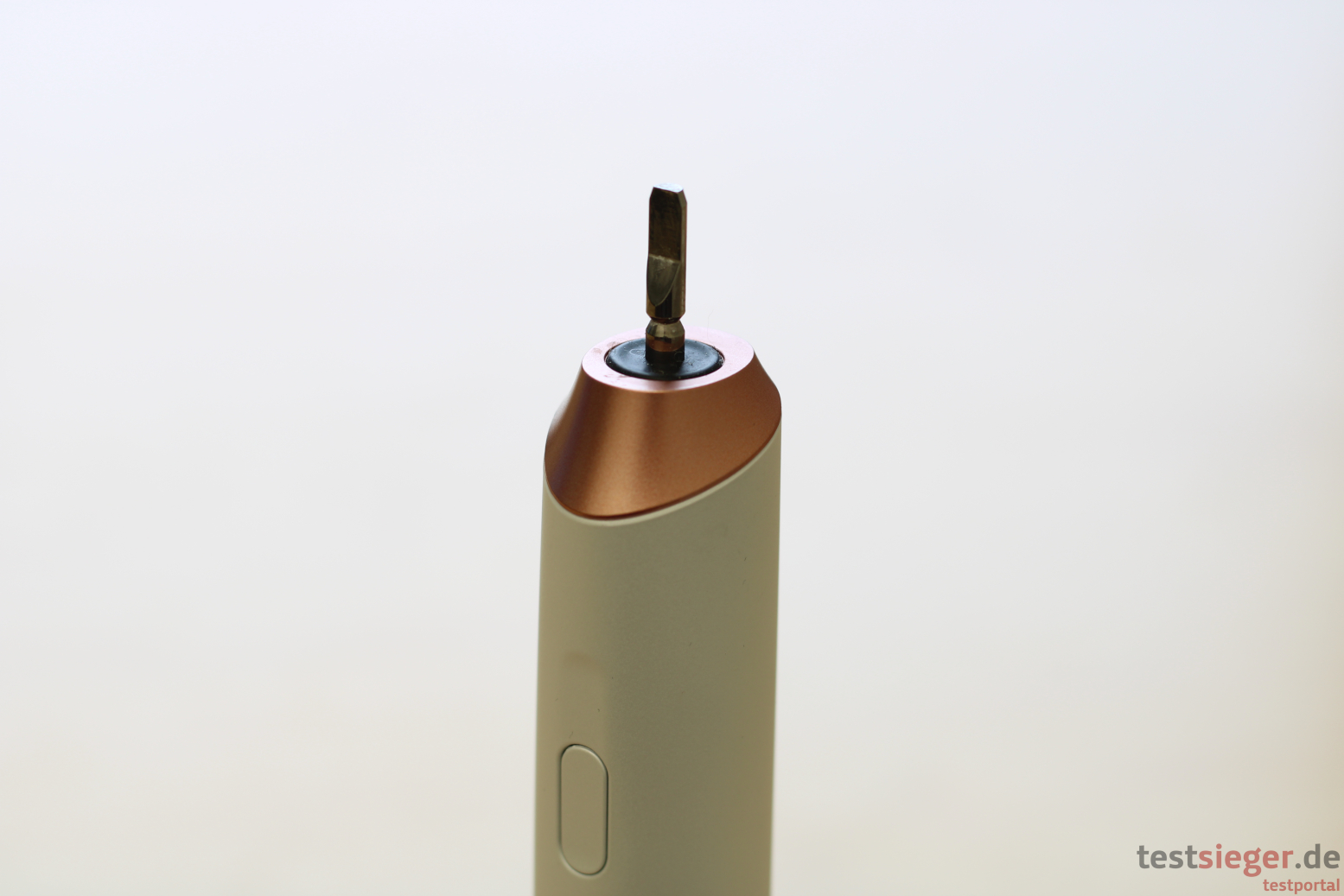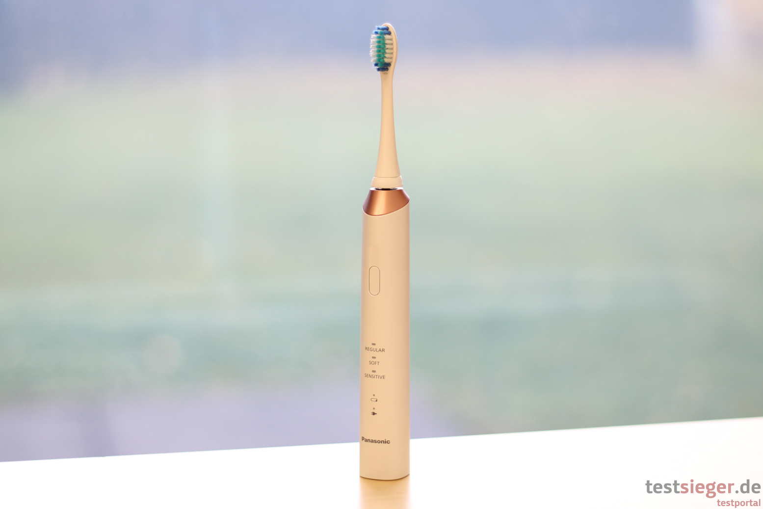 Uns gefällt die Panasonic EW-DC12 rein optisch bereits beim ersten Kontakt, was vor allem an der schlanken Formgebung oder der schicken Farbgebung in Weiß und Rosé liegt. Das ist aber natürlich Geschmackssache. Auf uns macht die Zahnbürste jedoch einen eleganten Eindruck. Die leicht glänzende Oberfläche ist nicht anfällig für unschöne Fingerabdrücke. Auch Kratzer stellen wir nach unserer Verwendungszeit von drei Wochen nicht fest. Mit aufgestecktem Bürstenkopf misst die Panasonic 2,4 Zentimeter in der Breite, 23,2 Zentimeter in der Höhe und 2,6 Zentimeter in der Tiefe, was die eher filigrane Bauweise noch einmal unterstreicht.Beim Handteil wie auch beim Aufsteckkopf verwendet Panasonic sehr wertigen Kunststoff. Das Material verformt sich selbst bei hoher Belastung nicht und schützt den Motor gut bei Stürzen auf den Badezimmerboden. Dabei besteht das Gehäuse nahezu aus einem Guss. Einzig der Boden und ein optisch ansprechender roséfarbener Ring sind separate Elemente. Dementsprechend entdecken wir nur sehr wenig Spaltmaße, die sich zudem absolut in Grenzen halten. Zwischen Bürsten- und Motoreinheit zeigt sich allerdings eine recht große Lücke, die natürlich bei den Schwingungen nötig ist, unserer Meinung nach aber ruhig etwas schmaler hätte ausfallen dürfen. Hier sammeln sich schnell Staub und Zahnpastareste. Alles in allem ist die Verarbeitungsqualität aber über jeden Zweifel erhaben und trägt zum wertigen Gesamtbild bei.