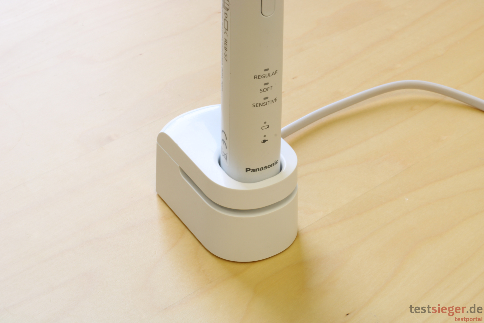 Die induktive Ladestation ist recht groß, dafür steht die Zahnbürste dank einer Einbuchtung auch recht sicher. Allerdings hätten wir uns noch ein paar Antirutschelemente auf der Unterseite der Station gewünscht, damit diese nicht verrutschen kann. Sobald Strom fließt, leuchtet eine kleine rote Indikator-LED auf. Erlischt diese, ist die Panasonic komplett geladen. Das dauert mit circa 17 Stunden jedoch sehr lange und es genügt nicht einmal die Zahnbürste über Nacht in der Station zu belassen. Geht die Batterie zur Neige, ertönt ein akustisches Signal und eine weitere Status-LED leuchtet.