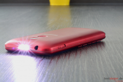 Auf der Vorderseite befinden sich die zehn Wahltasten, die klassischerweise auch zur Texteingabe dienen. Die Knöpfe sind mit einer Breite von 1,2 Zentimetern und einer Höhe von 0,9 Zentimeter recht groß gehalten und punkten durch einen angenehm leichten Druckpunkt. Ein weiterer Vorteil: Die Knöpfe sind leicht voneinander abgesetzt und lassen sich im Zweifel auch ertasten. Eine Tastenbeleuchtung, die die Bedienung im Dunkeln erleichtert, ist ebenfalls vorhanden. Im Zweifel kann der Nutzer auch auf die integrierte Taschenlampe an der Oberseite zurückgreifen, die zwar nicht sonderlich leuchtstark ist, aber trotzdem etwas Licht ins Dunkel bringt. Praktischerweise hat Panasonic der Lampe einen eigenen Schiebeschalter an der rechten Seite des Handys spendiert.