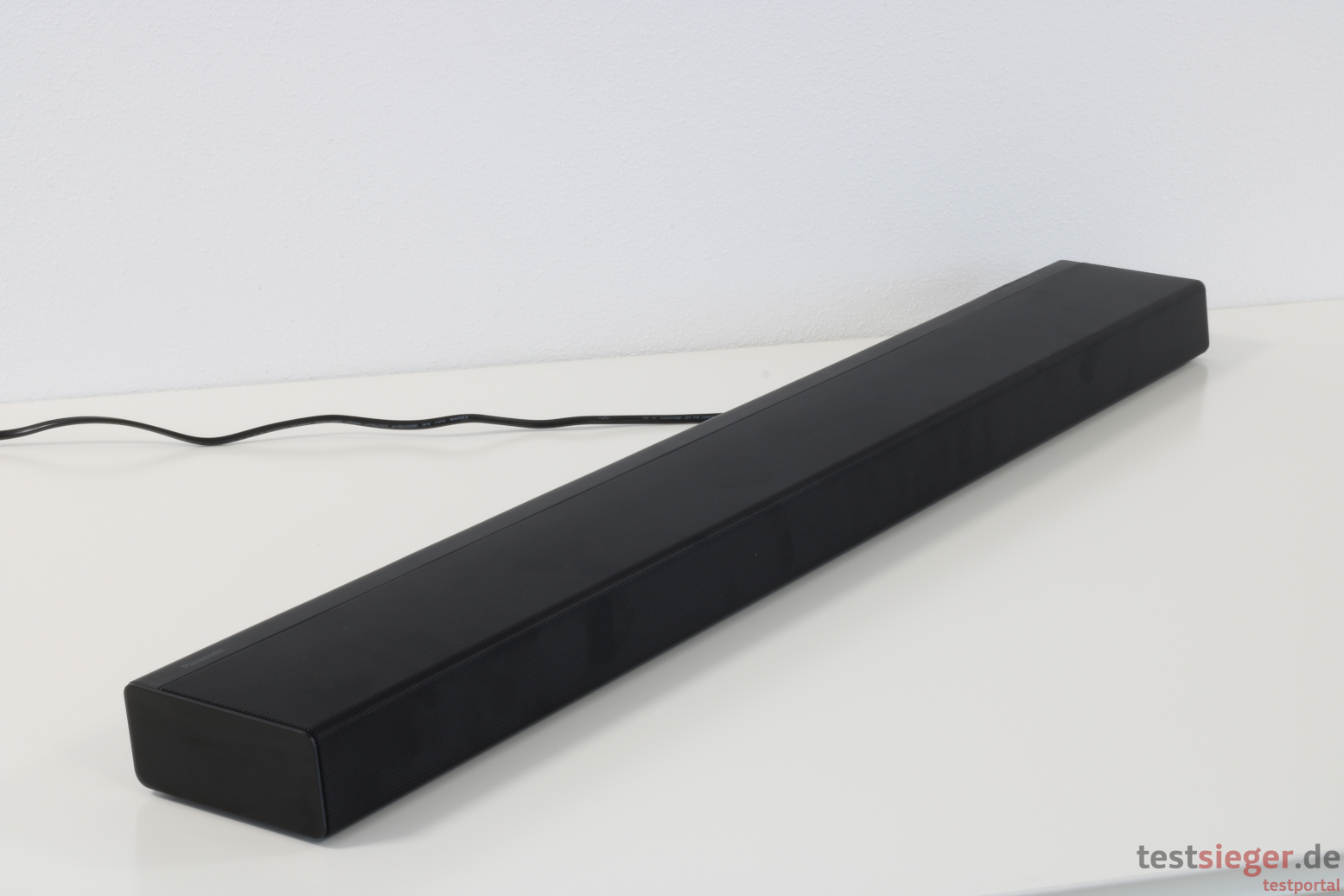 An der Verarbeitungsqualität haben wir nichts auszusetzen. Ein engmaschiges Metallgitter bedeckt die Front und einen Großteil der Oberseite – sehr schick. Das restliche Gehäuse besteht dagegen aus Kunststoff, doch auch hier hinterlässt das Material einen hochwertigen, robusten Eindruck und lässt sich nicht verformen. Die Übergänge der einzelnen Komponenten sind sauber verarbeitet. Wir konnten keine auffälligen Spaltmaße entdecken. Kleine gummierte Flächen an der Unterseite sorgen für eine sehr gute Rutschfestigkeit. Das Gehäuse des beiliegenden Subwoofers besteht zu einem Großteil aus MDF-Platten und macht ebenfalls einen äußerst wertigen Eindruck. Mit Abmessungen von 19 Zentimetern in der Breite, knapp 41,5 Zentimetern in der Höhe und 38,5 Zentimetern in der Tiefe gehört er zu den größeren Tieftönern, zumindest in Kombination mit einer Soundbar und weckt damit große Erwartungen in Sachen Basswiedergabe.