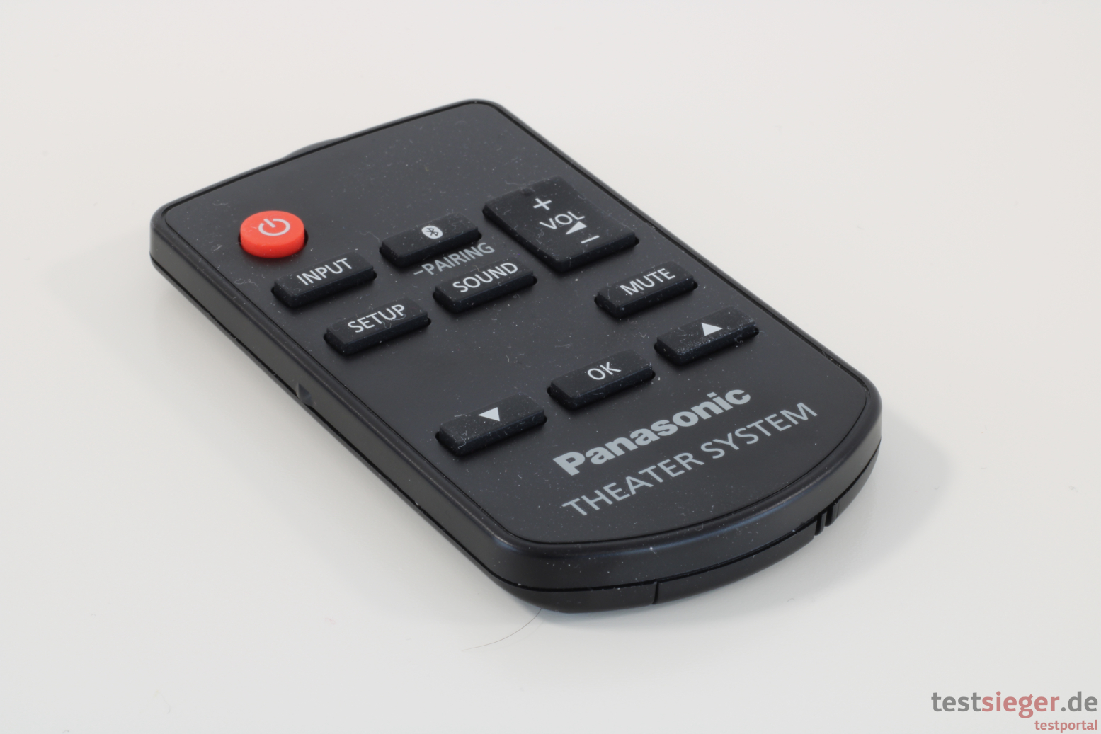 Apropos Steuerung: An der Soundbar befinden sich fünf Tasten auf der Oberseite. Hier schaltet der Nutzer die Panasonic ein, regelt die Lautstärke, schaltet die verschiedenen Eingangsquellen durch oder startet das Bluetooth-Pairing. Damit sind alle wichtigen Einstellungen möglich, wer weiter in die Tiefe gehen möchte, muss zur kompakten Fernbedienung greifen. Diese passt allerdings nicht zur sonst so wertigen Soundbar. Der verwendete Kunststoff wirkt nicht sonderlich hochwertig und auch sonst ist die Haptik nicht optimal. Zudem benötigt die Bedienung etwas Einarbeitung. Wer beispielsweise den virtuellen Surround-Sound aktivieren möchte, muss dreimal die Sound-Taste betätigen, dann den Menüpunkt über OK wählen und mit den Pfeiltasten der Fernbedienung die gewünschte Einstellung vornehmen. Das ist nicht sonderlich intuitiv, wir bevorzugen eine größere Fernbedienung mit mehr Direktwahltasten. Einen ähnlichen Weg muss der Nutzer gehen, um die fünf Equalizer-Presets zu erreichen. Hier stehen ihm Standard, Music, Cinema, News und Voice zur Verfügung. Das alphanumerische Display unter dem Frontgitter erleichtert die Handhabung deutlich. Hier weiß der Nutzer immer, welcher Menüpunkt gerade aktiv oder welche Lautstärke gewählt ist.