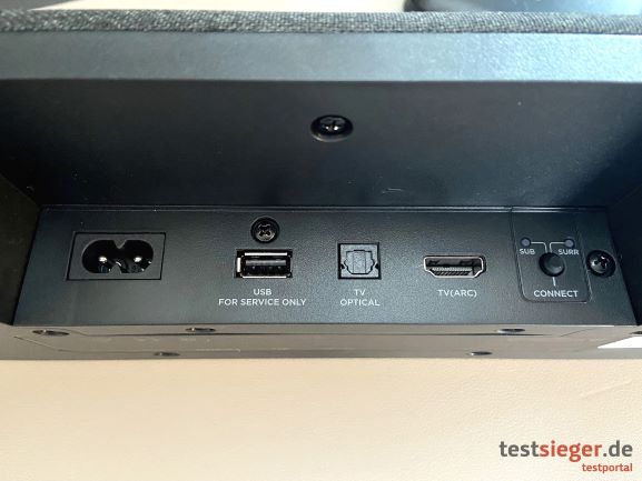 Auf der Rückseite gibt es neben den beiden Löchern zur Wandmontage eine Einbuchtung mit den Anschlussstellen. Der USB-Anschluss steht ausschließlich für Service-Arbeiten zur Verfügung, Audio-Dateien können wir hierüber nicht abspielen. Dem optischen Eingang folgt der HDMI-Eingang, über den wir die Soundbar mit dem TV-Gerät verbinden. Ein zusätzlicher kleiner Druckknopf bietet die Möglichkeit, die Soundbar kabellos mit einem Subwoofer, zum Beispiel dem React-Sub, oder zusätzlichen kompatiblen Lautsprechern zu koppeln. Laut Hersteller ist die Soundbar durch den integrierten Sprachassistenten Alexa auch Multiroom-fähig. Das ermöglicht eine einfache Verbindung mit Amazon Alexa kompatiblen Geräten.