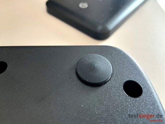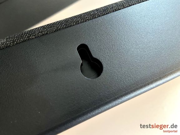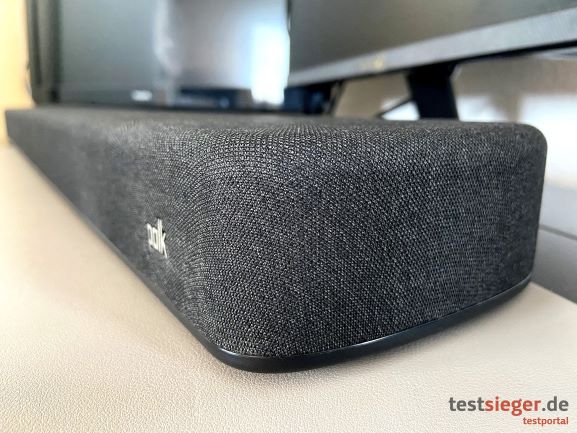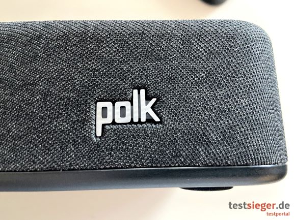 Die React liegt uns als schwarzes Modell vor, weitere Farbvarianten gibt es derzeit nicht. Auf den ersten Blick macht die Soundbar einen schicken und hochwertigen Eindruck, auch wenn Design natürlich Geschmackssache ist. Unseren trifft sie aber voll: Das Gehäuse ist mit einem schwarzen, feinmaschigen Stoff bezogen, die Ecken sind abgerundet. In der rechten unteren Ecke auf der Vorderseite hebt sich das Polk-Logo in silbernen Lettern vom Rest ab. Auf der Oberseite befindet sich ein kreisrundes Bedienfeld. Hier regeln wir per Tastendruck die Lautstärke, schalten das Mikrofon ein oder aus und aktivieren den Sprachassistenten. Die Rück- und Unterseite sind aus hochwertigem Kunststoff. An der Unterseite sorgen vier gummierte Standfüße für sicheren Halt. Mit einer Höhe von 5,7 Zentimetern ragt die Soundbar niedrigeren TV-Geräten nicht in den Bildschirm. Mit einer Tiefe von 12,1 Zentimetern und einer Breite von 87 Zentimetern passt sie auch auf kleinere Fernsehkommoden. Vorsicht ist jedoch geboten, denn der Stoffbezug um das Gehäuse lässt sich leicht in die darunterliegenden Löcher drücken. Zu viel Druck sollte man hier also nicht ausüben.Die Übergänge zwischen den Materialien sind sauber, große Spaltmaße finden wir an der Soundbar keine, mit Ausnahme am Bedienfeld. Hier messen wir zwischen Stoff und Kunststoff drei Millimeter Abstand, ebenso tief ist der Rand um das Bedienfeld herum. Der Optik tut das keinen Abbruch. Nach längerer Benutzung der Soundbar sehen wir aber um und auf dem Bedienfeld Staub. Dieser ist besonders im Rand schwer zu entfernen. Fingerabdrücke sind zum Teil zu sehen, diese entfernen wir einfach mit einem Mikrofasertuch.