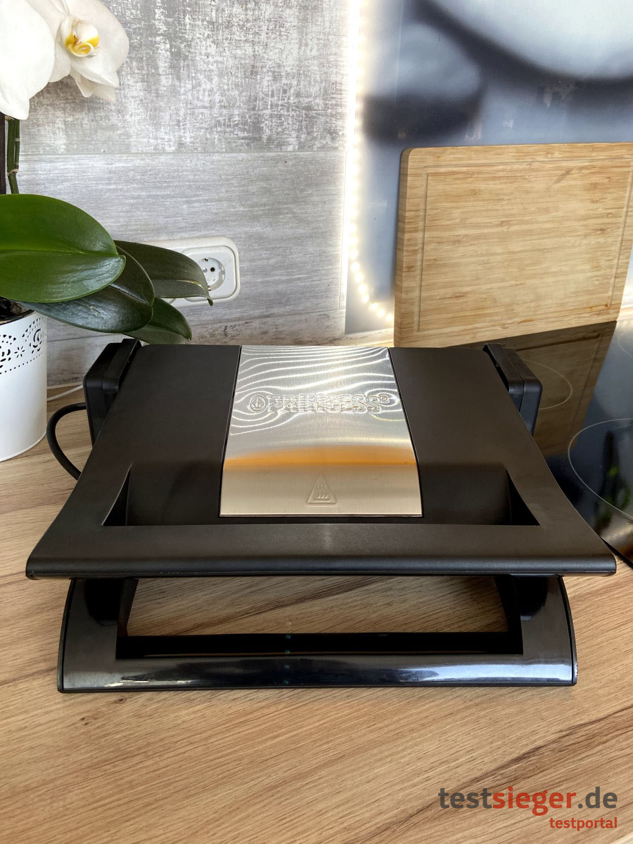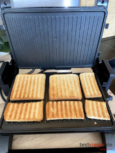 Wir probieren die mittlere Hitzeeinstellung aus und warten 2-3 Minuten, wie die Anleitung für die Zubereitung von Sandwiches empfiehlt. Nach der angegebenen Zeit ist das Toast aber nur leicht kross. Wir drehen also die Temperatur voll auf und nach weiteren 3 Minuten haben wir ein wunderbar krosses und gebräuntes Sandwich. Sehr gut: Je nach Dicke des Grillguts passt sich die obere Abdeckung automatisch an und liegt perfekt auf, sodass auch die Oberseite stets gut gegrillt wird.