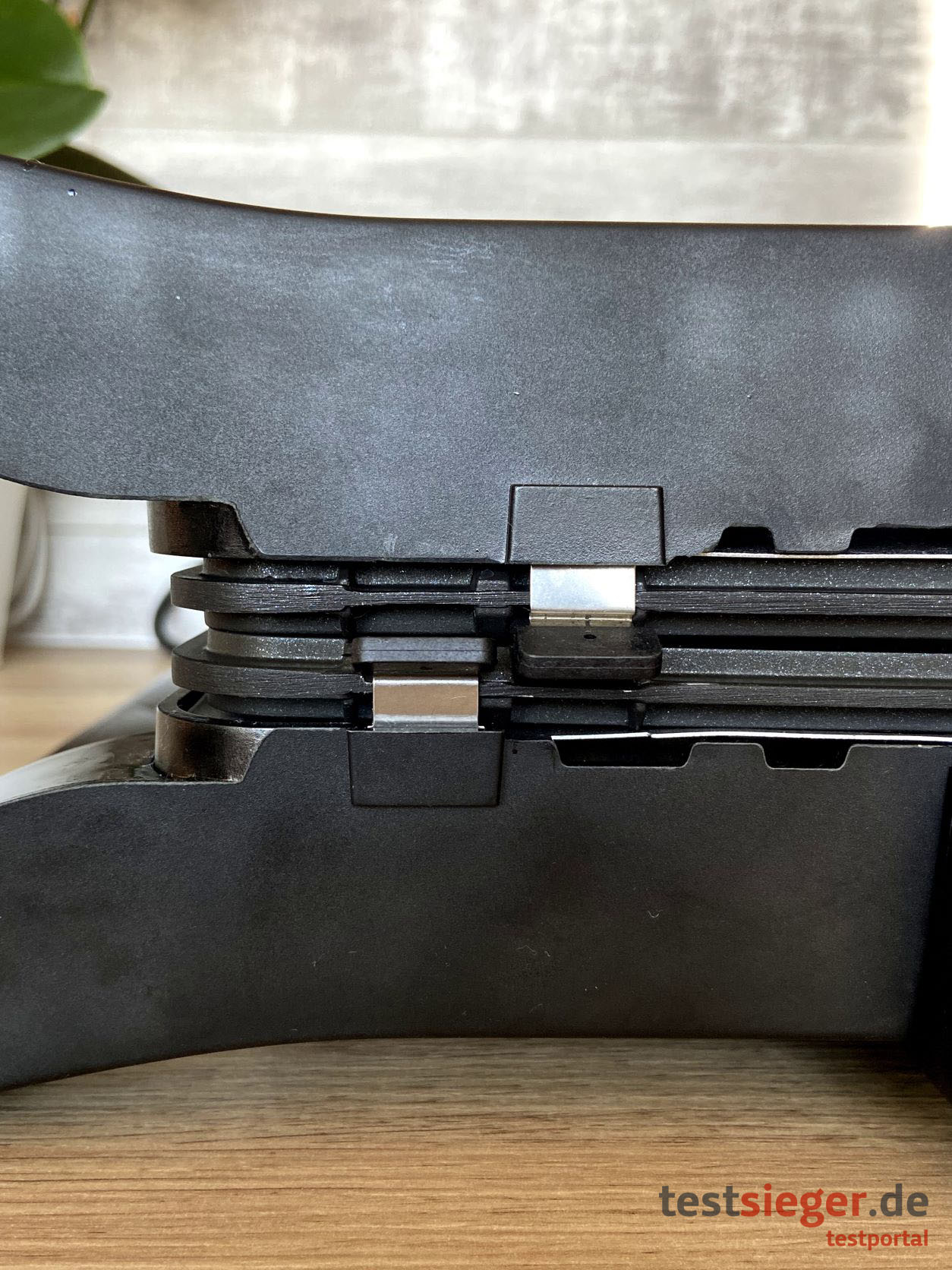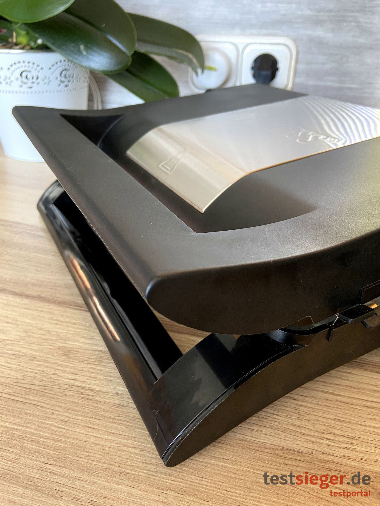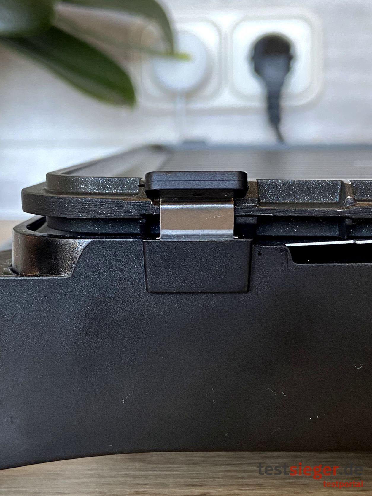 Im großen Ganzen ist der Grill recht robust, auch wenn die Halteklemmen für die Grillplatten an den Seiten ein wenig herausstehen. Hier ist Vorsicht geboten, damit die Klemmen nicht verbiegen oder gar abbrechen. Nutzerinnen und Nutzer sollten die Abdeckungen nicht zu fest aufeinanderpressen, wenn keine Grillplatten eingesetzt sind. Hier können sich die Halteklemmen besonders leicht verkanten. Auch die Grillplatten aus Gussaluminium erfordern eine vorsichtige Handhabung, damit diese nicht zerbrechen.
