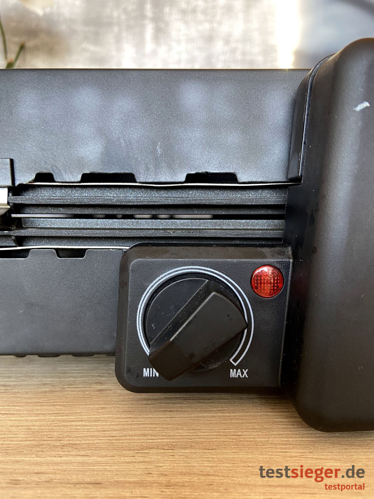 Als einzige Einstellungsmöglichkeit am Gerät dient der Drehregler für die Temperatur. Dieser ist sehr leicht zu bedienen, erscheint aber auch sehr locker montiert zu sein. Weitere Einstellungen etwa zur Zeit oder Bedienung der separaten Platten gibt es nicht. Auch Automatikprogramme sind nicht vorhanden. Wie bereits erwähnt ist der Princess nicht gerade klein, was aber positiv für die Grillfläche ist: Mit Abmessungen von 30 Zentimeter in der Breite und 20 Zentimetern in der Höhe ist der Grill auch für größere Kochvorhaben bestens geeignet. Zwei mittelgroße Steaks neben 4 Würstchen finden problemlos auf einer Platte Platz. Das Stromkabel misst 1 Meter, dieses hätte ein wenig länger ausfallen dürfen.