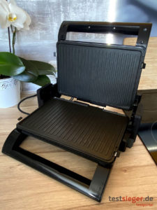 Für die Inbetriebnahme hilft ein Blick in die Bedienungsanleitung, die wichtigsten Informationen zu den Funktionen sind hier kurz und knapp aufgelistet. Die Bedienung geht aber auch ohne Anleitung leicht und intuitiv von der Hand. Um die Grillplatten einzusetzen, klemmen wir diese mit den dafür vorgesehenen Halteklemmen fest. Die obere Grillplatte setzen wir erst mit den unteren Einkerbungen auf, dann klemmen wir die Platte fest. Beim Entfernen der oberen Platte sollten Nutzerinnen und Nutzer stets gut aufpassen, damit die Platte nicht herausfällt und eventuell zerbricht.